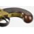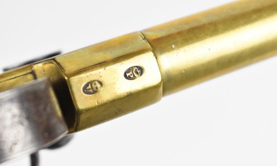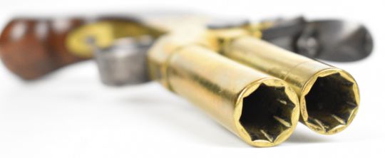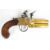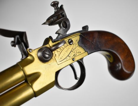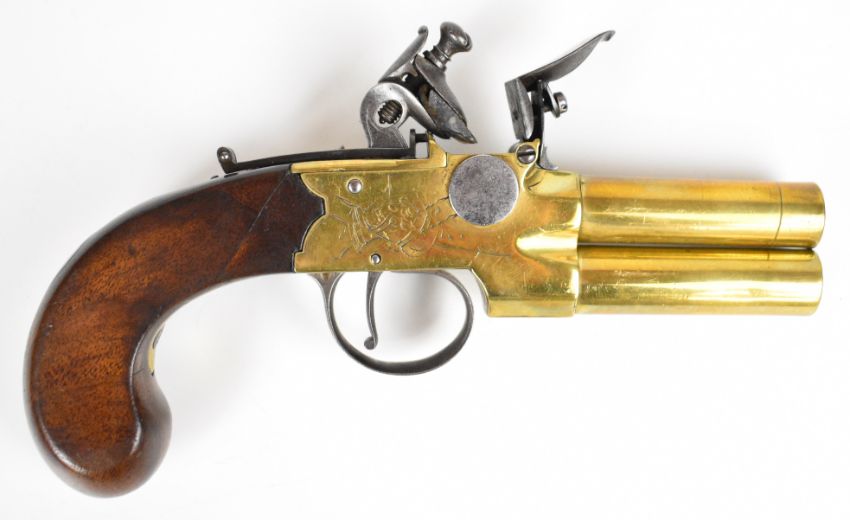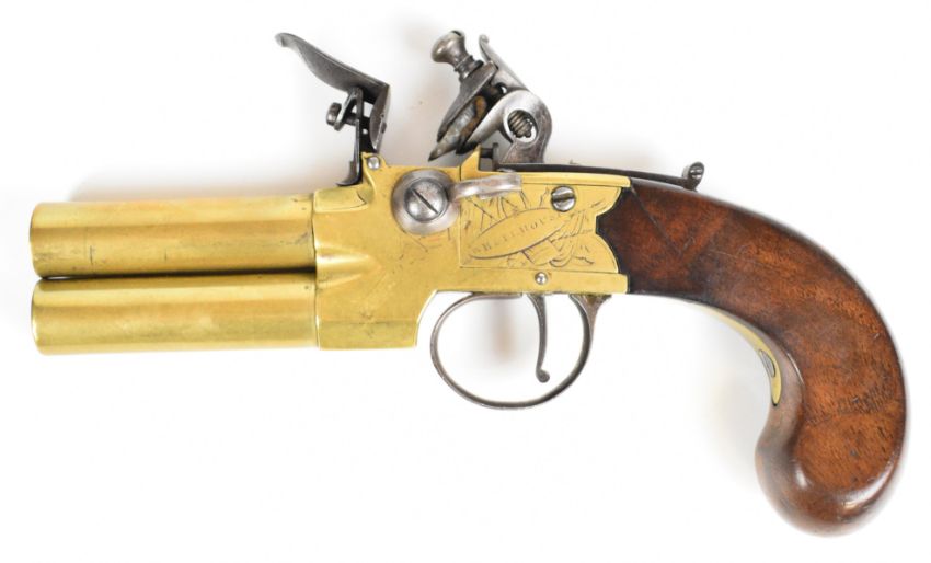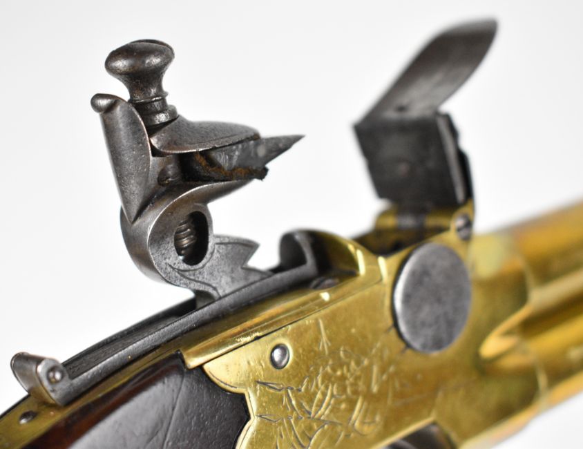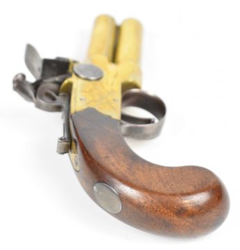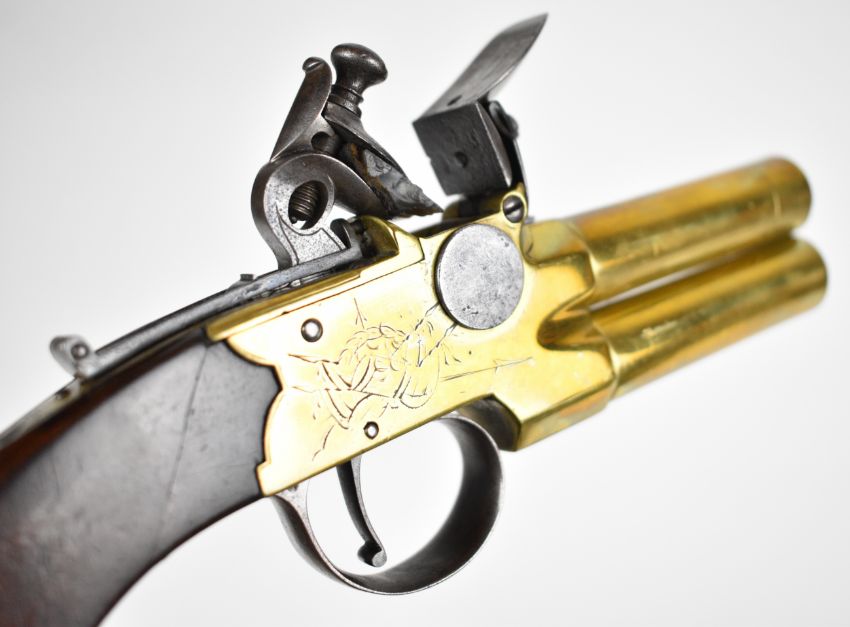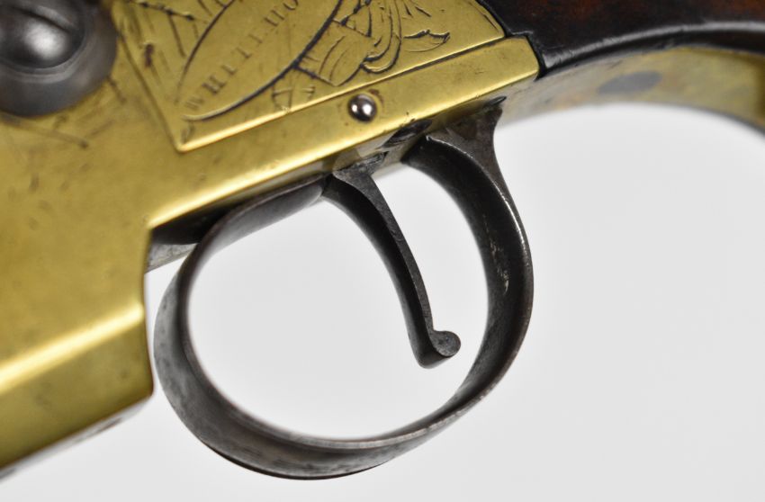 Whitehouse brass flintlock double barrelled over and under tap-action coat pistol with named and engraved locks, engraved trigger guard, hammer and thumb slide safety, shaped wooden grips, vacant wrist cartouche and 3 inch turn-off barrels, overall length 19.5cm.