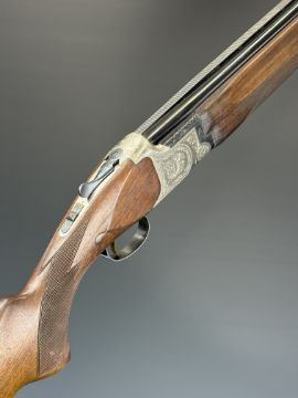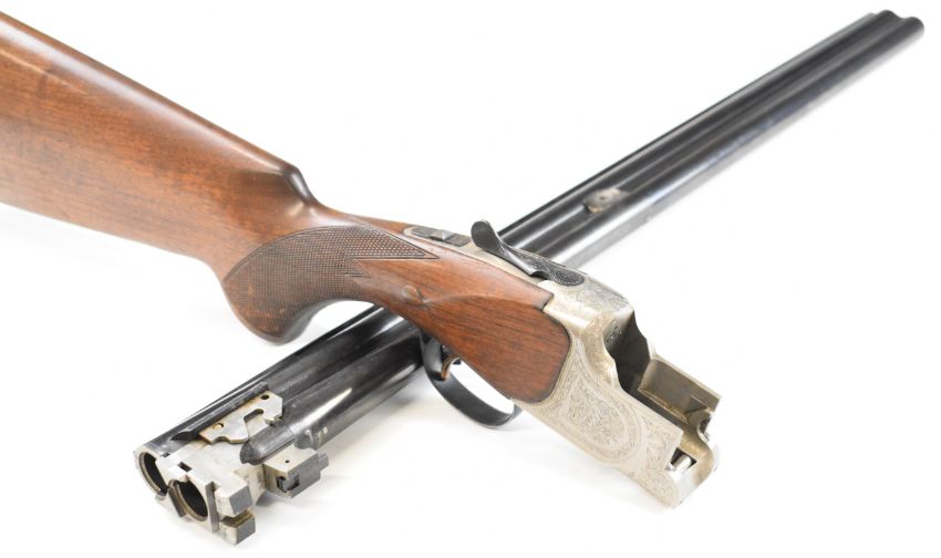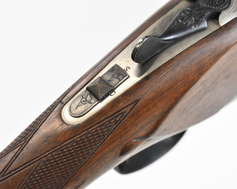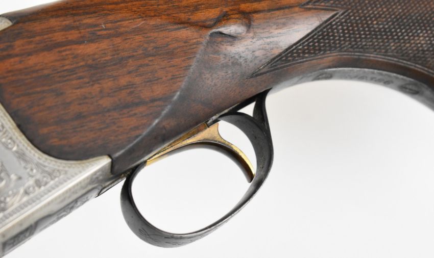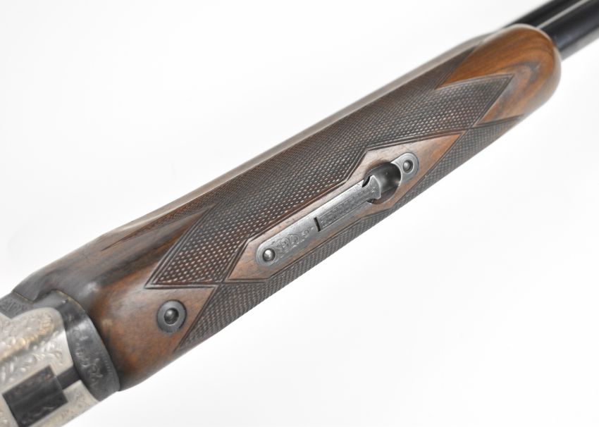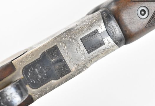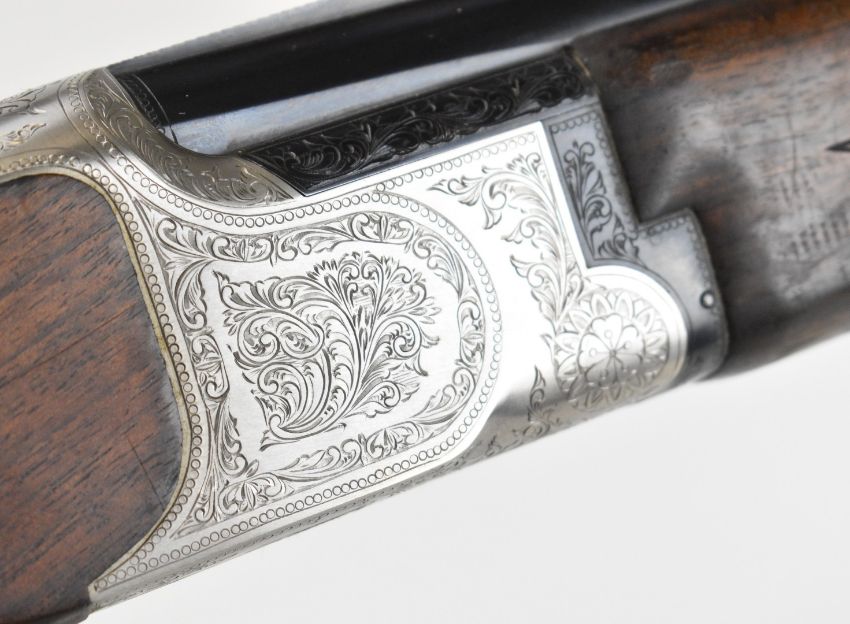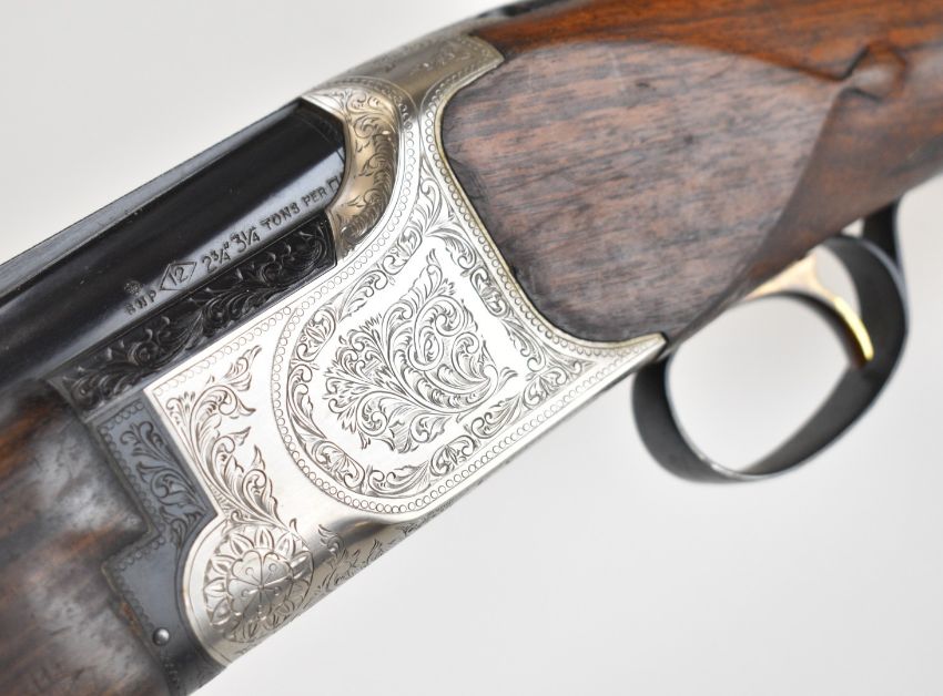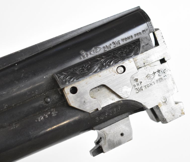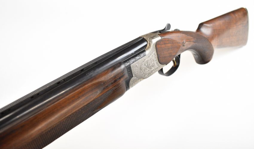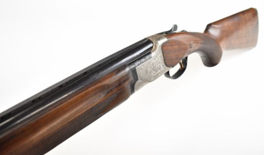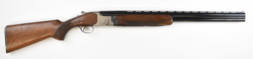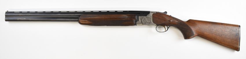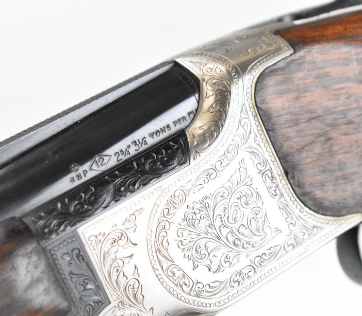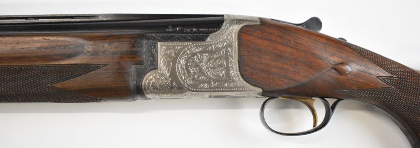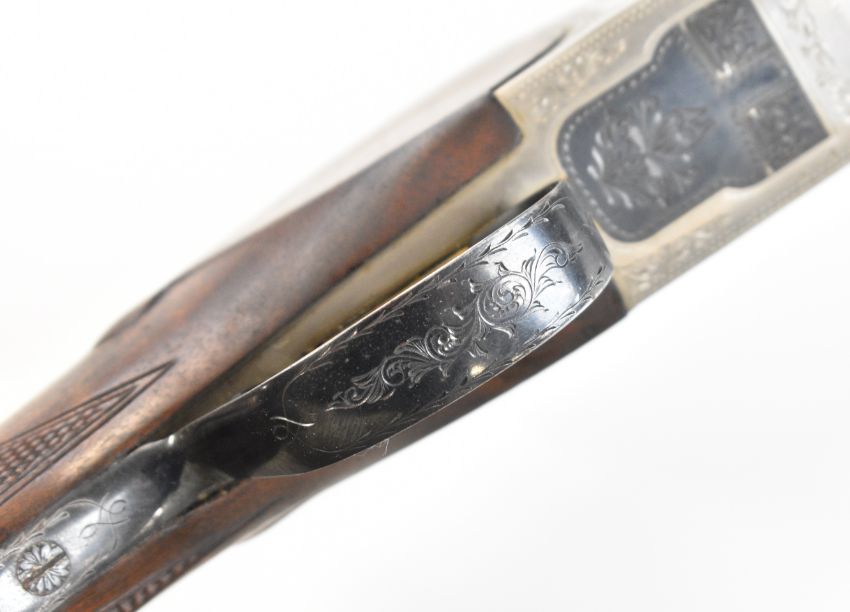 Miroku 12 bore over and under ejector shotgun with engraved locks, underside, trigger guard and thumb lever, chequered semi-pistol grip and forend, carved teardrop to the wrist, single trigger, vented top rib and 26 inch barrels choked ¼ and improved cylinder, overall length 108.5cm, length of pull 35.5cm, serial number 346386. PLEASE NOTE THAT A VALID RELEVANT SHOTGUN CERTIFICATE IS REQUIRED TO VIEW OR PURCHASE THIS LOT AND FOR ALL SHOTGUNS OR RIFLES. PLEASE ENSURE YOU HAVE THE RELEVANT CERTIFICATE BEFORE BIDDING.