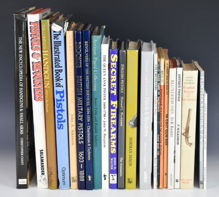 [Handguns] The British Duelling Pistol by John Atkinson 1978. British Military Pistols 1603-1888 by R.E. Brooker Jr published 1978. English Pistols by Howard Blackmore 1985. Georgian Pistols by Dixon 1971. Revolvers of the British Services 1854-1954. The Queen Anne Pistol 1660-1780. Collector's Guide to Pistols & Revolvers. The New Encyclopaedia of Handguns & Small Arms by Christopher Chant. German Miniature Revolvers 1890-1940 by John Cooper. Colt Revolvers published Royal Armouries. Secret Firearms, An Illustrated History of Miniature and Concealed Handguns etc (22)