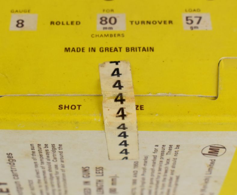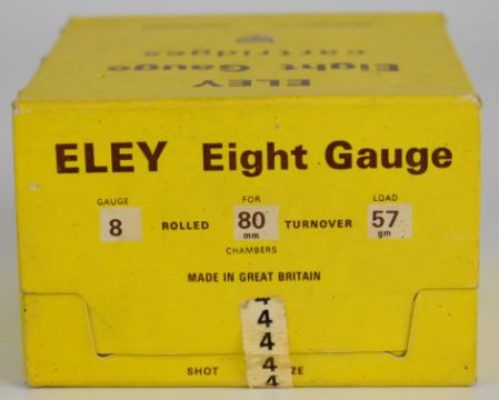 Twenty five 8 bore Eley Rolled Turnover Smokeless Non-Corrosive Water-Resisting 2oz shotgun cartridges, in original box. PLEASE NOTE THAT A VALID RELEVANT SHOTGUN CERTIFICATE IS REQUIRED TO VIEW OR PURCHASE THIS LOT AND FOR ALL SHOTGUNS, RIFLES OR AMMUNITION PLEASE ENSURE YOU HAVE THE RELEVANT CERTIFICATE BEFORE BIDDING. PLEASE ALSO NOTE THAT AMMUNITION CANNOT BE SENT IN THE POST.