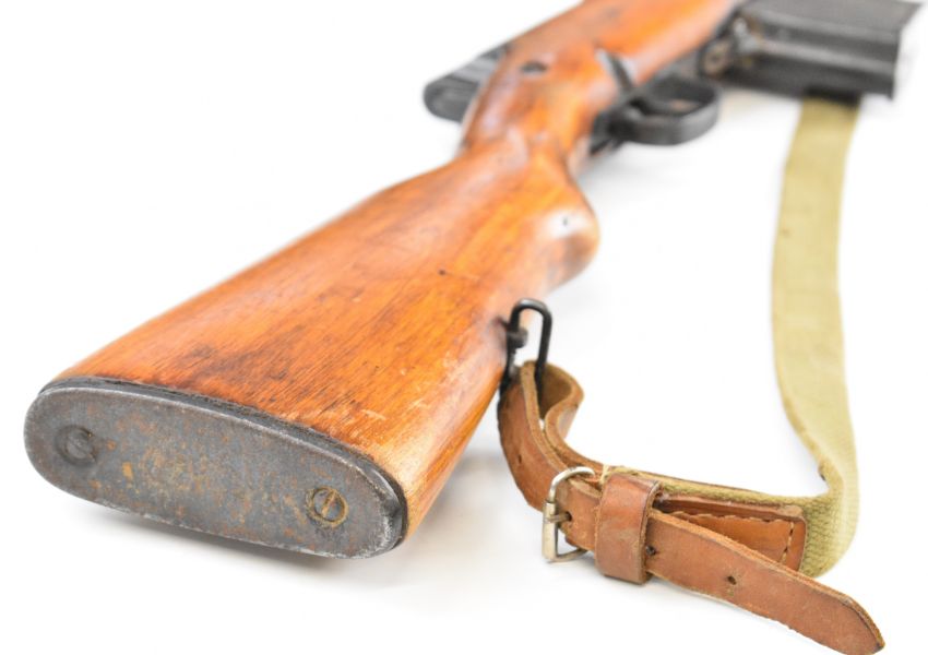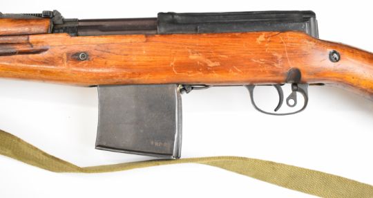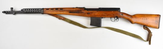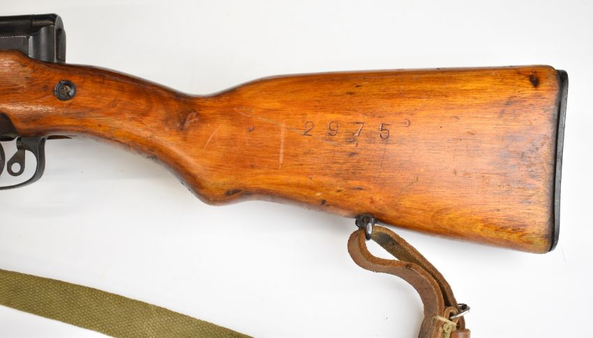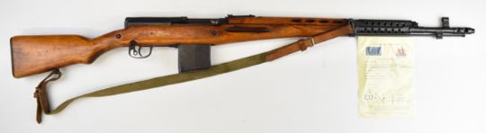 Deactivated Russian Tokarev SVT40 7.62 semi-automatic bolt action rifle with top plate stamped '1943' below a star, pierced barrel guard, adjustable sights, canvas and leather sling, magazine and 26 inch barrel, overall length 121.5cm, serial number BA2975, with deactivation certificate dated 29/09/2025.