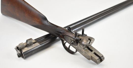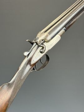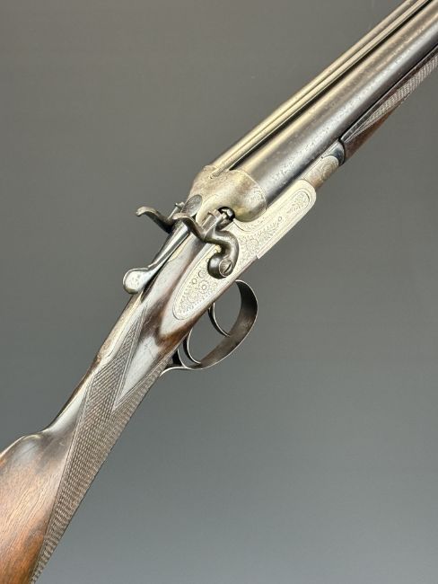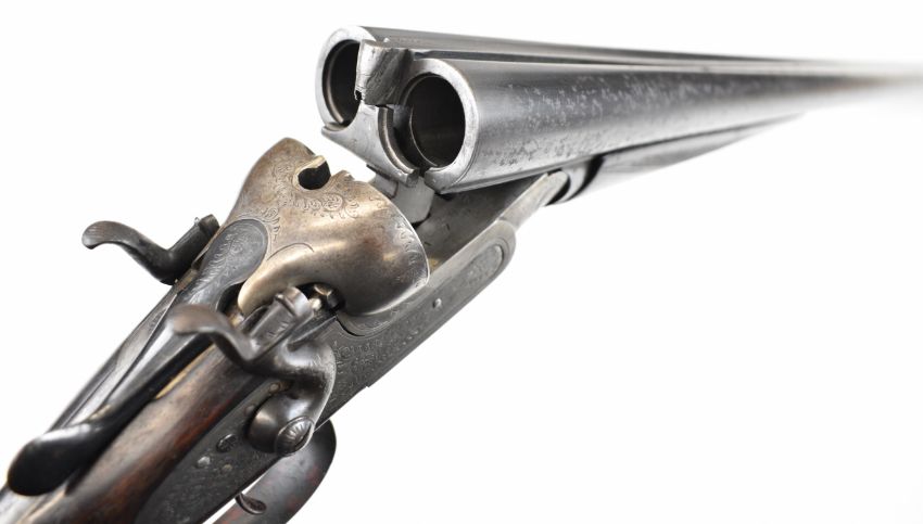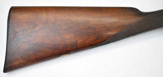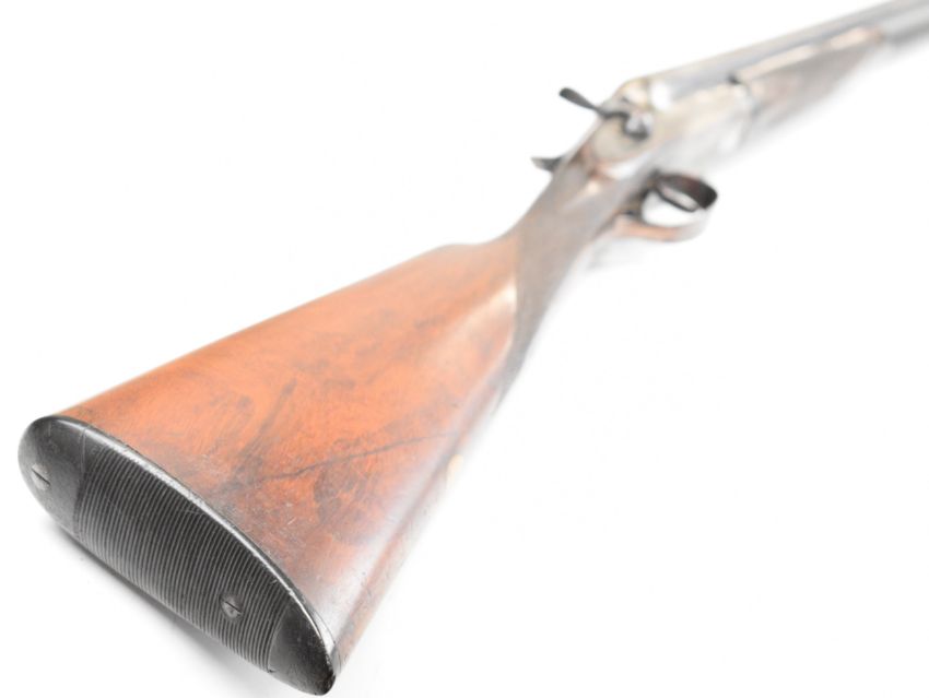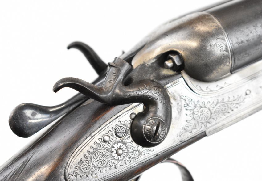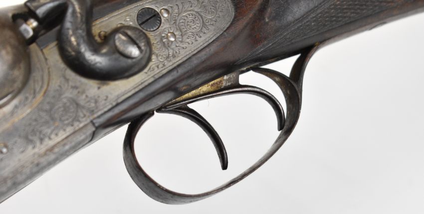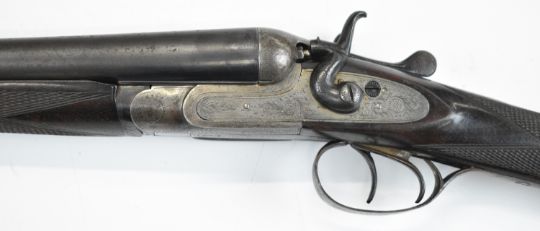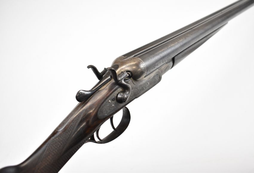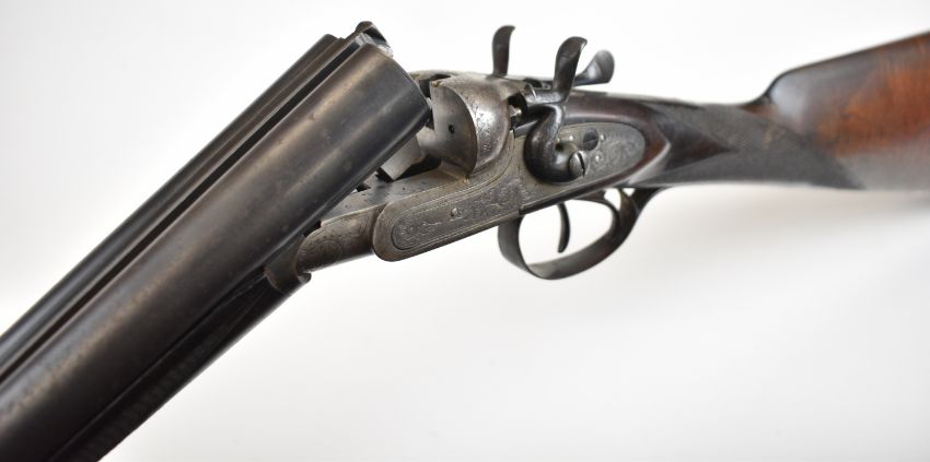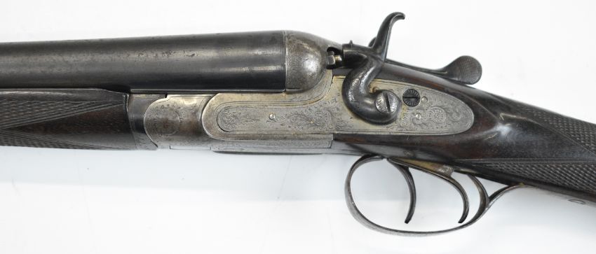 Thomas Wild 16 bore side by side hammer action shotgun with engraved locks, hammers, underside, trigger guard, top plate, thumb lever and fences, chequered grip and horn tipped forend, double trigger and named 28 inch barrels, overall length 113cm, length of pull 36.5cm, serial number 17080. PLEASE NOTE THAT A VALID RELEVANT SHOTGUN CERTIFICATE IS REQUIRED TO VIEW OR PURCHASE THIS LOT AND FOR ALL SHOTGUNS OR RIFLES PLEASE ENSURE YOU HAVE THE RELEVANT CERTIFICATE BEFORE BIDDING.