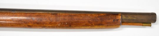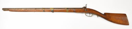 Percussion hammer action sporting gun with brass trigger guard and barrel bands, brass tipped wooden ram-rod and 29 inch smooth bored barrel, overall length 113cm.