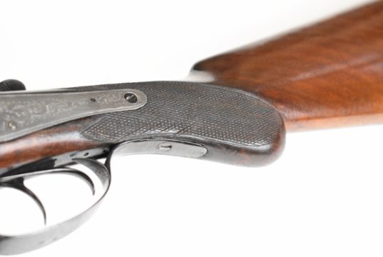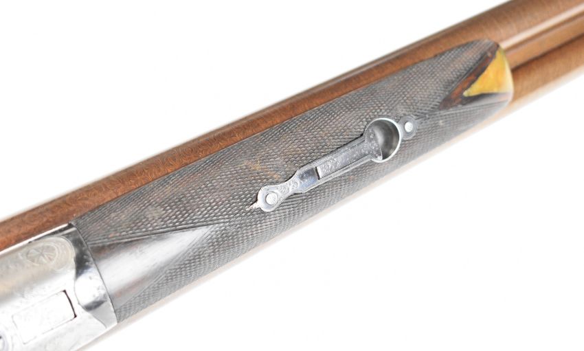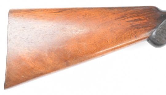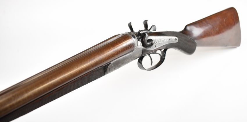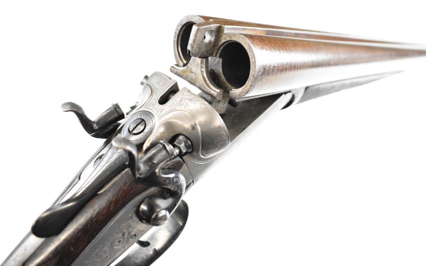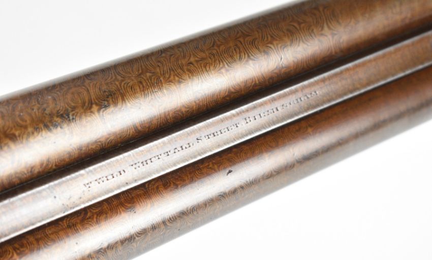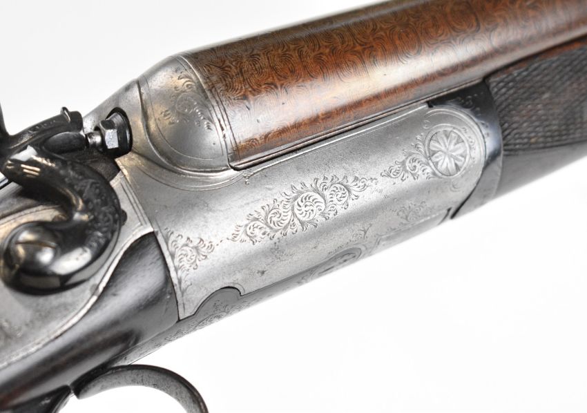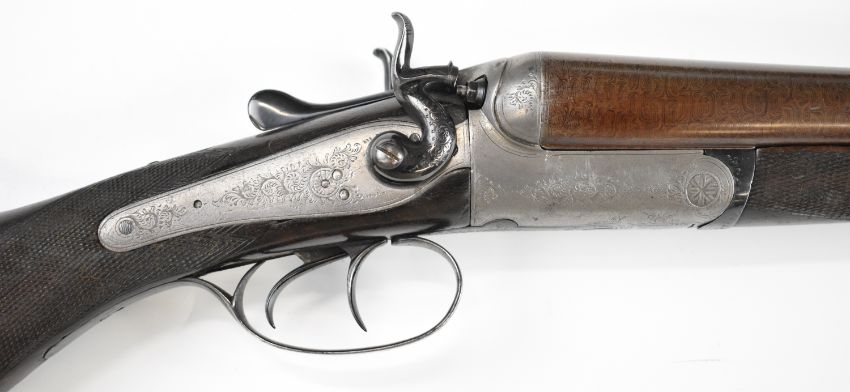 Thomas Wild 12 bore side by side hammer action shotgun with engraved locks, hammers, underside, top plate, thumb lever and fences, chequered semi-pistol grip and horn tipped forend, double trigger and named 30 inch Damascus barrels choked cylinder, overall length 118.5cm, length of pull 36.5cm, serial number 6322. PLEASE NOTE THAT A VALID RELEVANT SHOTGUN CERTIFICATE IS REQUIRED TO VIEW OR PURCHASE THIS LOT AND FOR ALL SHOTGUNS OR RIFLES. PLEASE ENSURE YOU HAVE THE RELEVANT CERTIFICATE BEFORE BIDDING.