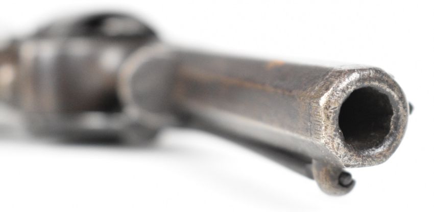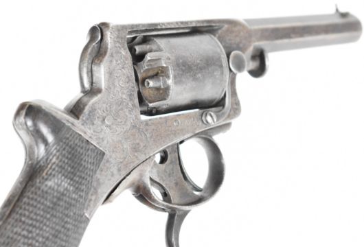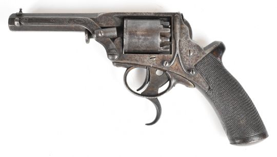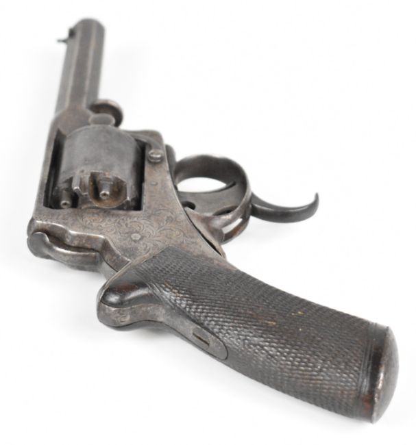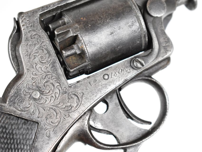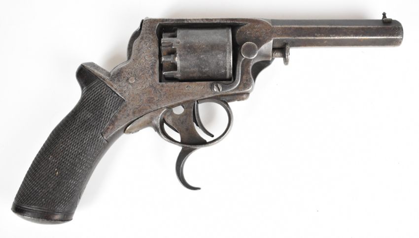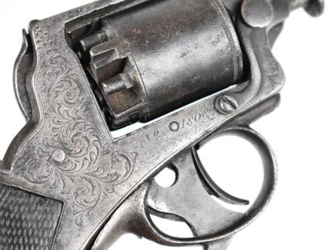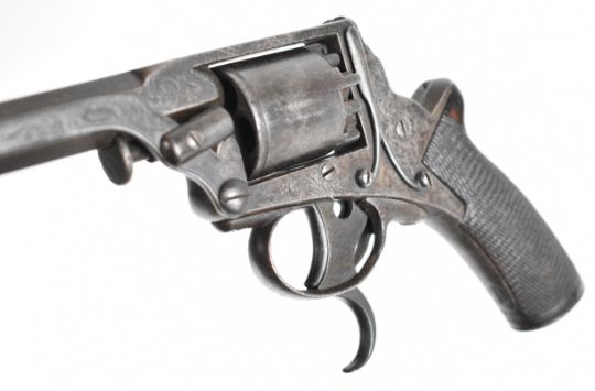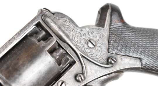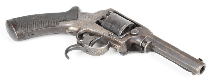 William Tranter Tranter's Patent five-shot self-cocking semi-hammerless revolver with spurred trigger. engraved trigger guard, frame and butt plate, chequered grip, frame marked 'No 18082' and 3.75 inch rifled octagonal barrel, overall length 23.5cm,