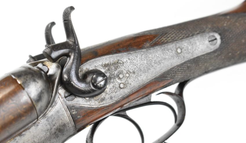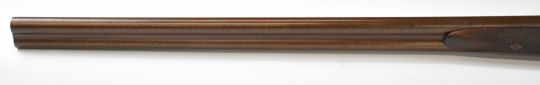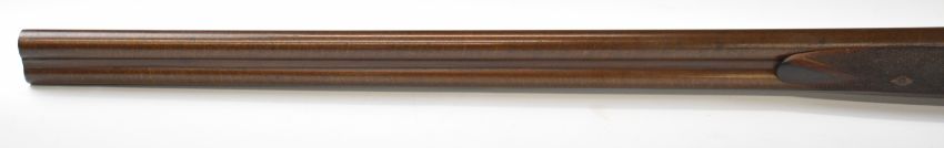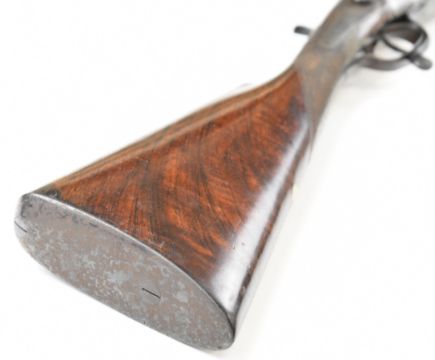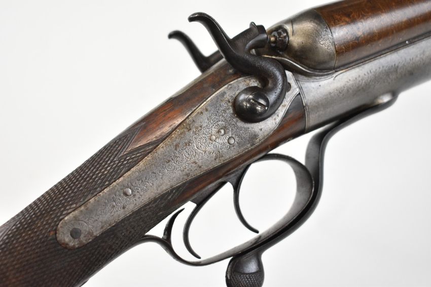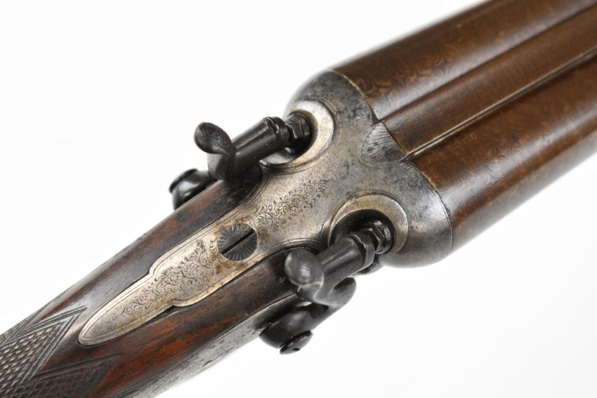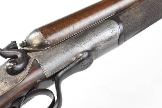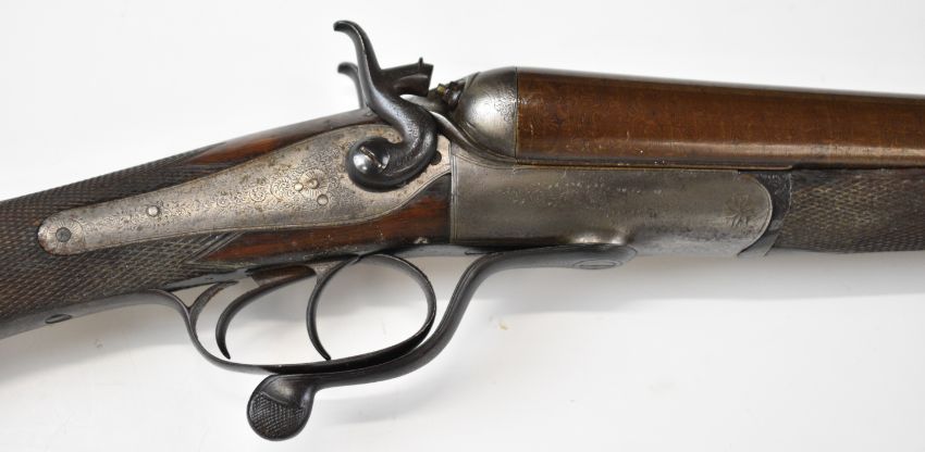 Indistinctly named 12 bore side by side hammer action shotgun with named and engraved locks, engraved hammers, trigger guard, rotary underlever, underside, top plate and fences, chequered grip and horn tipped forend, vacant cartouche to the underside of the stock, double trigger and 30 inch Damascus barrels choked improved cylinder and ½, overall length 118cm, length of pull 36.5cm, serial number 1586. PLEASE NOTE THAT THIS GUN IS BEING SOLD AS STOCK AND ACTION ONLY AND THAT A VALID RELEVANT RFD CERTIFICATE IS REQUIRED TO VIEW OR PURCHASE THIS LOT.