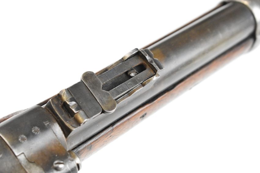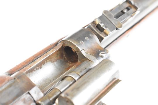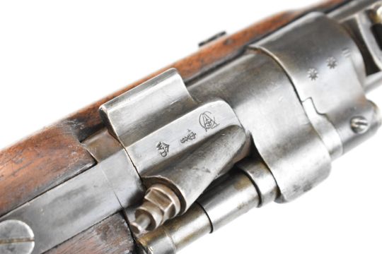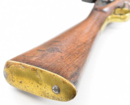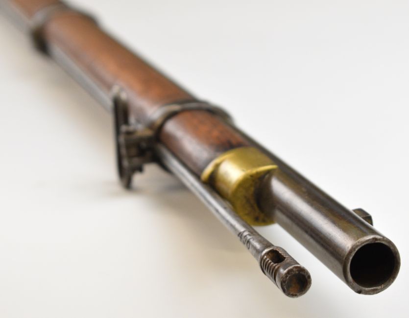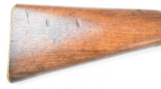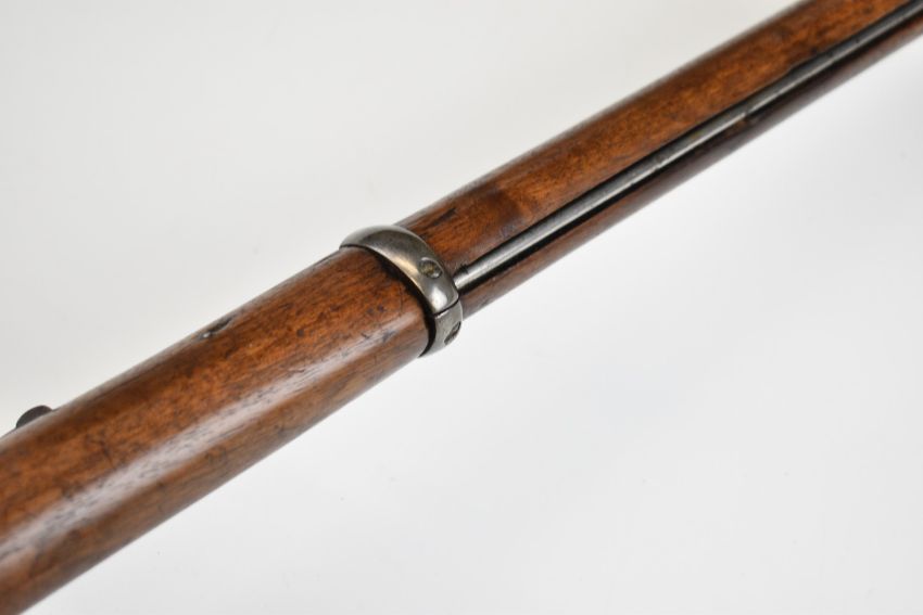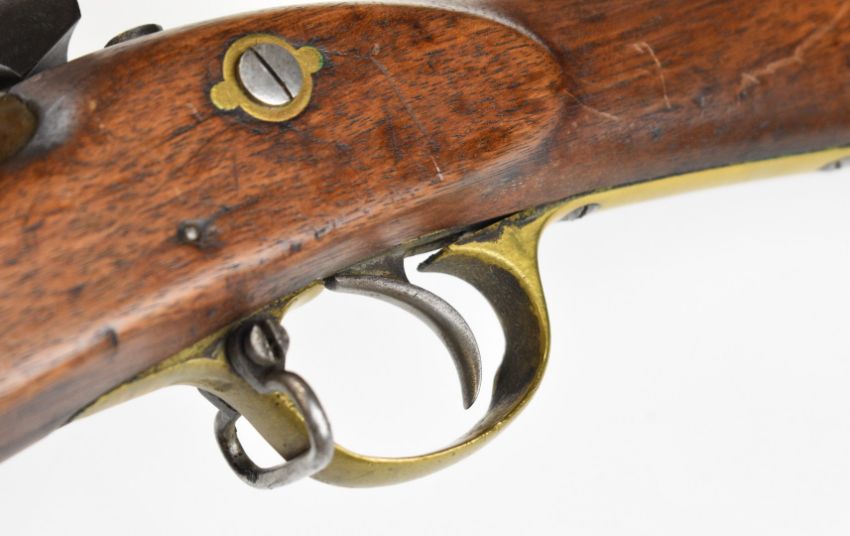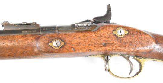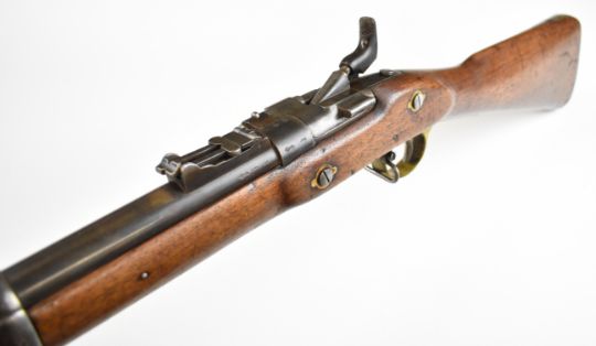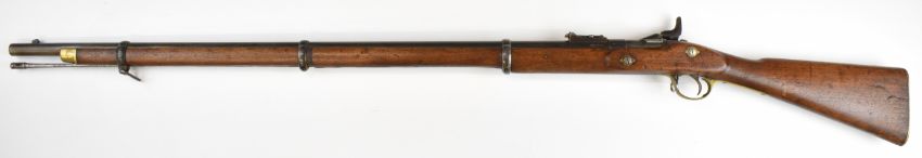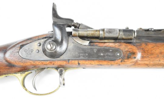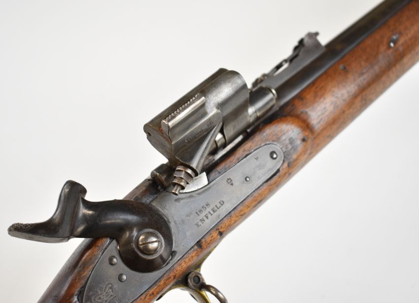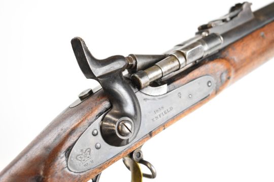 Enfield 3-band .577 hammer action Snider rifle with lock stamped '1858 Enfield' and with crown over 'VR' cypher, breech stamped 'WD amongst other markings, adjustable folding ladder sights, brass trigger guard, butt plate stamped '59' and '482', sling suspension loops and 36.5 inch rifled barrel, overall length 137.5cm.