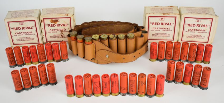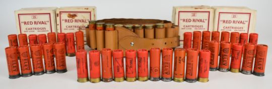 One hundred and forty six 12 bore shotgun cartridges including Red Rival, some in original boxes and some in a brown leather shotgun cartridge belt. PLEASE NOTE THAT A VALID RELEVANT SHOTGUN CERTIFICATE IS REQUIRED TO VIEW OR PURCHASE THIS LOT AND FOR ALL SHOTGUNS, RIFLES OR AMMUNITION PLEASE ENSURE YOU HAVE THE RELEVANT CERTIFICATE BEFORE BIDDING. PLEASE ALSO NOTE THAT AMMUNITION CANNOT BE SENT IN THE POST.