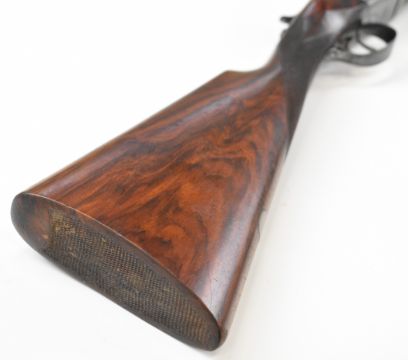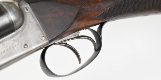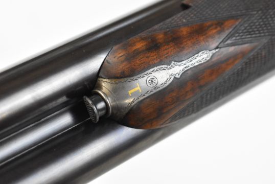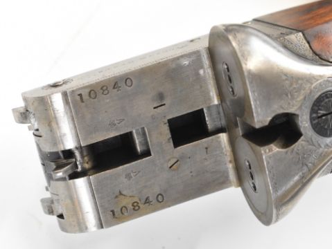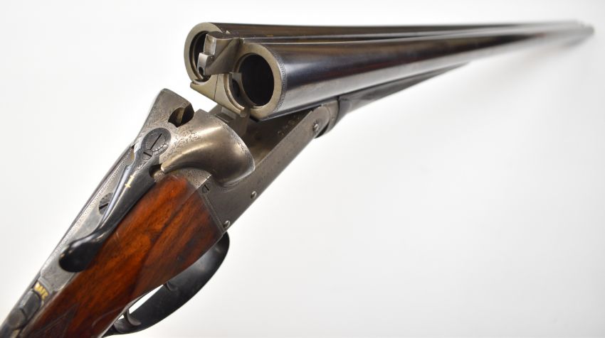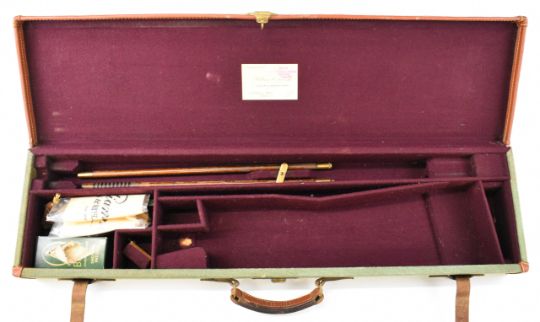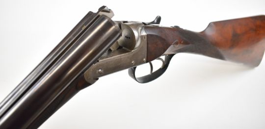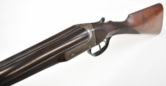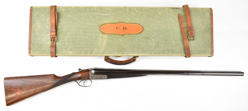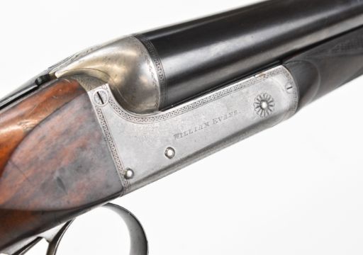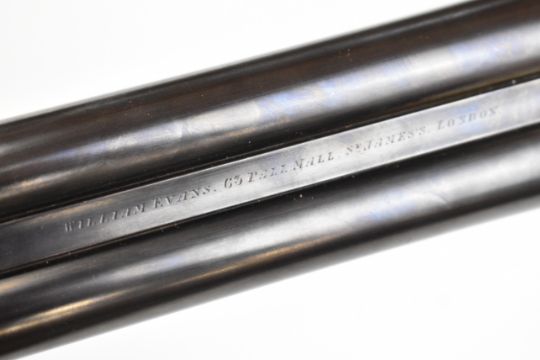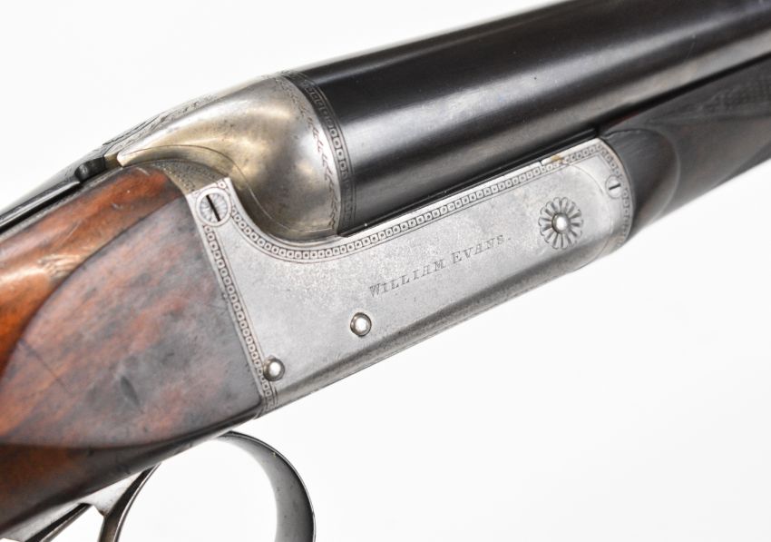 William Evans 12 bore side by side ejector shotgun with named and border engraved locks, border engraved underside, trigger guard, top plate, thumb lever and fences, chequered grip and forend, carved teardrop to the wrist, vacant cartouche to the underside of the stock, double trigger and named 28 inch barrels choked cylinder and ¼, overall length 113.5cm, length of pull 37.5cm, serial number 10840, in canvas and leather bound case with fitted interior and 'William Evans Ltd Gun & Rifle Manufacturers 67A St James's Street London SW1' label. PLEASE NOTE THAT A VALID RELEVANT SHOTGUN CERTIFICATE IS REQUIRED TO VIEW OR PURCHASE THIS LOT AND FOR ALL SHOTGUNS OR RIFLES PLEASE ENSURE YOU HAVE THE RELEVANT CERTIFICATE BEFORE BIDDING.