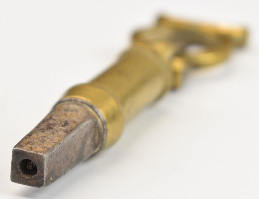 James Dixon & Sons folding brass and steel shooting or gun tool with whistle, 12 bore shotgun cartridge extractor, turnscrew and carriage key, 11cm long.