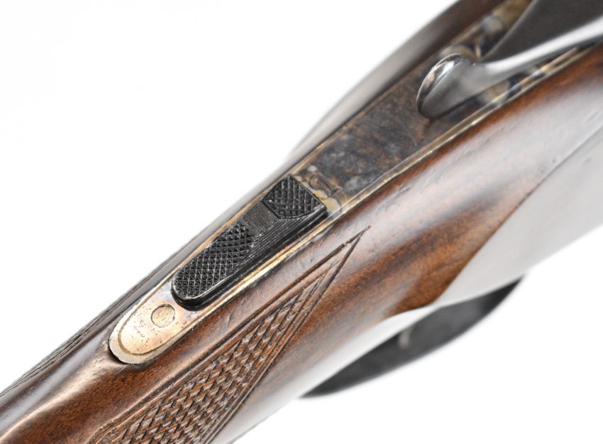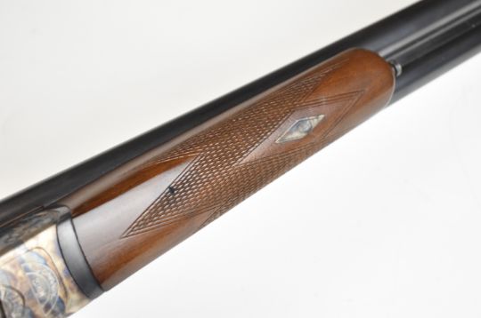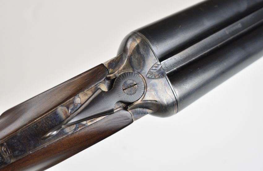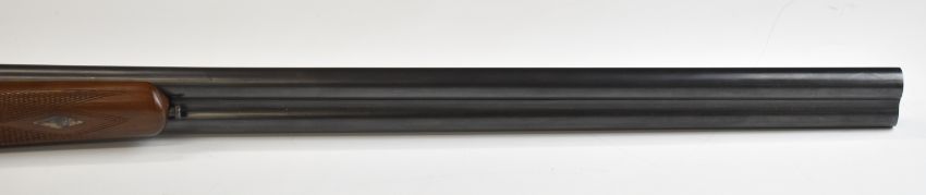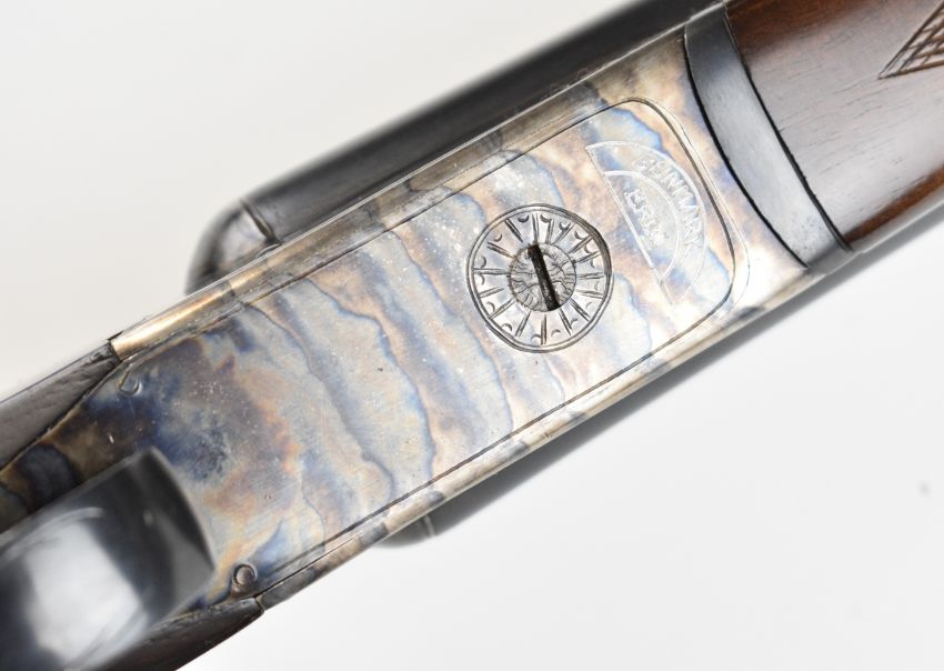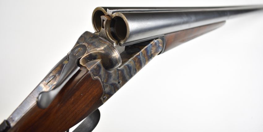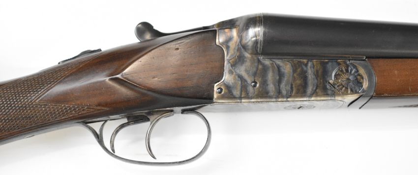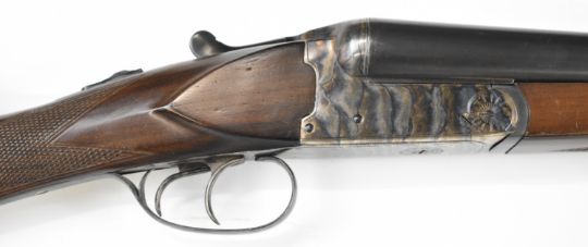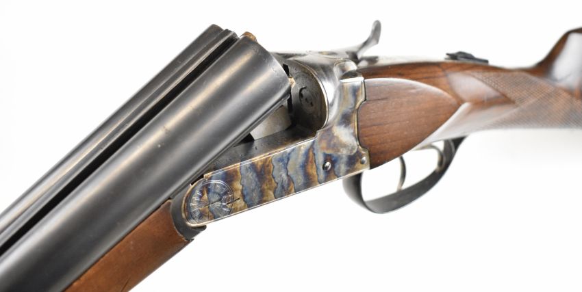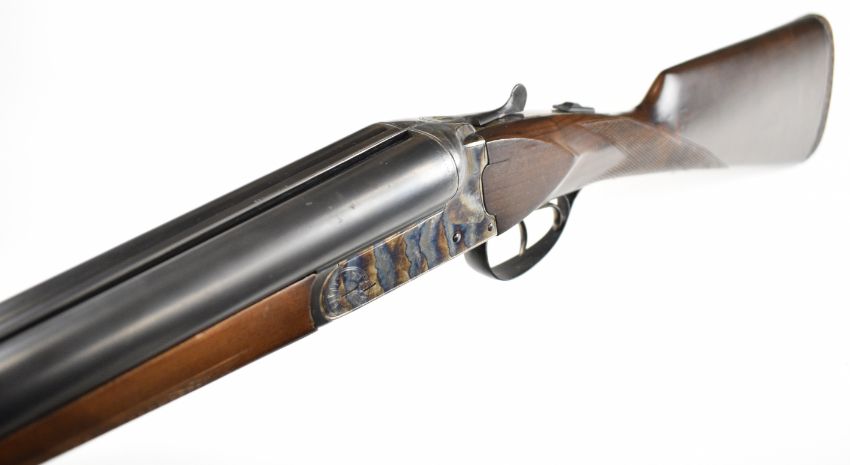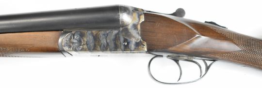 Gunmark Harrier 12 bore side by side shotgun with named underside, chequered grip and forend, double trigger and named 27.75 inch barrels choked improved cylinder and ¾, overall length 116cm, length of pull 39cm, serial number 75625. PLEASE NOTE THAT A VALID RELEVANT SHOTGUN CERTIFICATE IS REQUIRED TO VIEW OR PURCHASE THIS LOT AND FOR ALL SHOTGUNS OR RIFLES PLEASE ENSURE YOU HAVE THE RELEVANT CERTIFICATE BEFORE BIDDING.