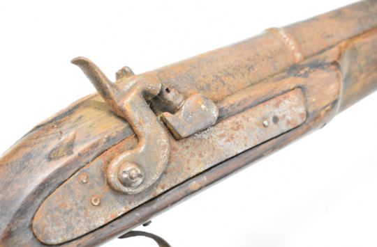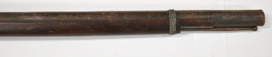 Eastern percussion hammer action gun with floral studded decoration to the stock, white metal wire barrel bands and 44.5 inch smooth bored barrel, overall length 156cm.