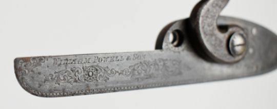 A pair of William Powell percussion hammer action shotgun locks with scrolling engraving to the named lock plates and hammers, each approximately 12.5cm long. Removed from a gun with serial number 6564 c1870.