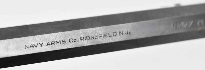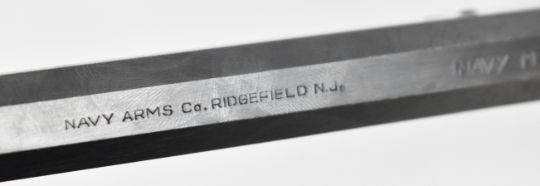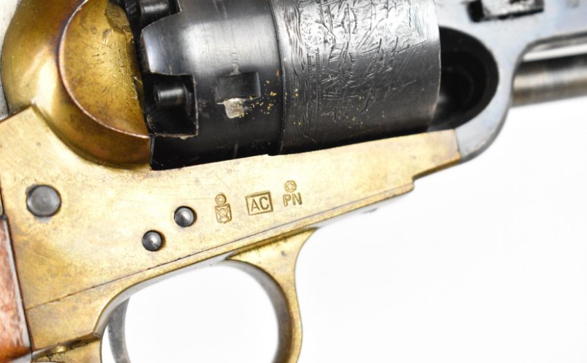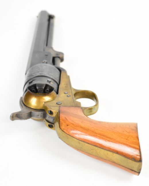 Navy Arms Co Model 1851 .44 six-shot single-action percussion revolver with engraved scenes of ships to the cylinder, brass trigger guard, wooden grips and 7.5 inch octagonal barrel, overall length 35cm, serial number 115331, in T C Williams embossed leather holster. PLEASE NOTE THAT A VALID RELEVANT FIREARMS CERTIFICATE IS REQUIRED TO VIEW OR PURCHASE THIS LOT AND FOR ALL SHOTGUNS OR RIFLES PLEASE ENSURE YOU HAVE THE RELEVANT CERTIFICATE BEFORE BIDDING.