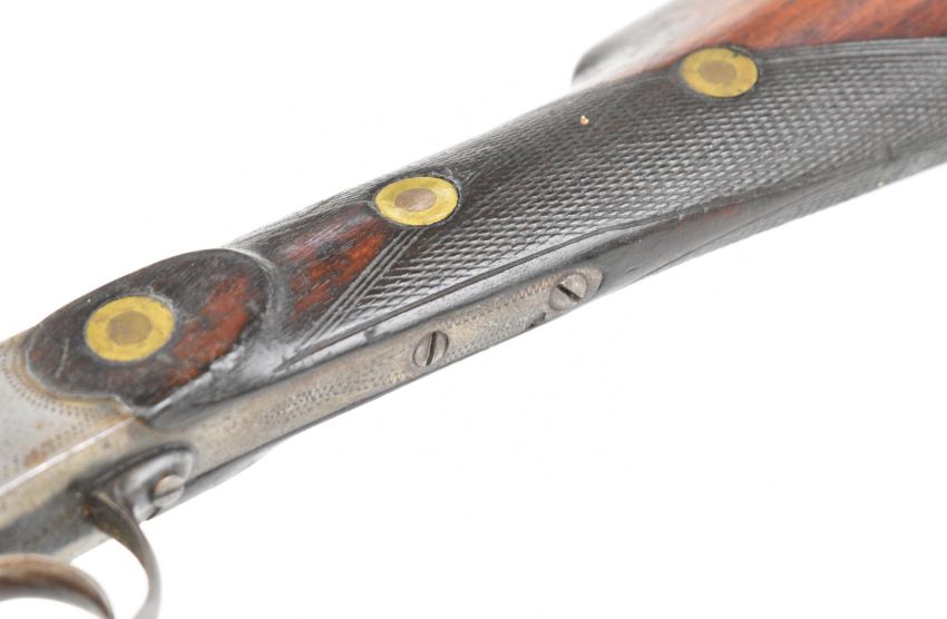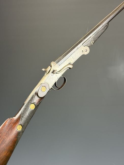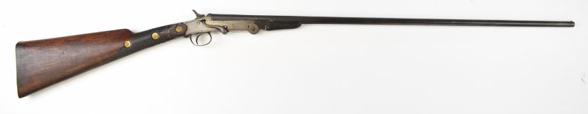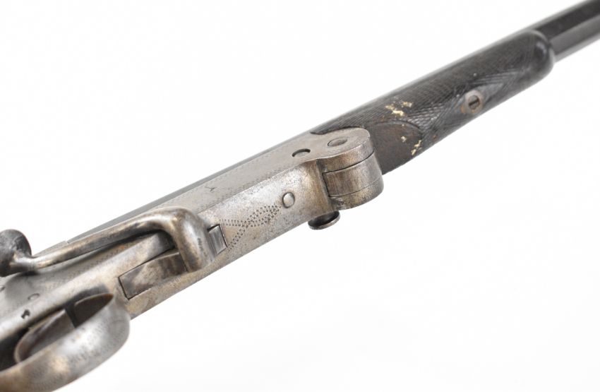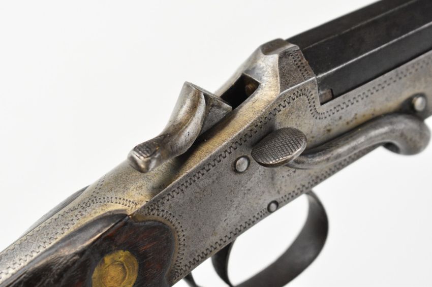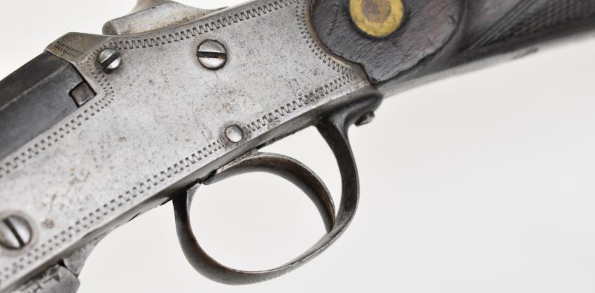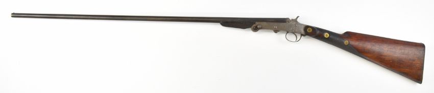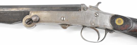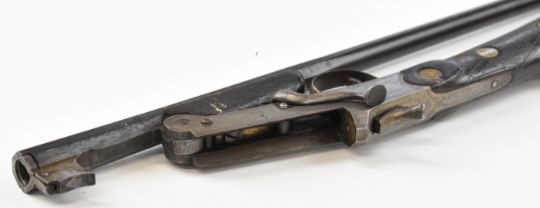 Belgian .410 hammer action folding poacher's shotgun with engraved action, chequered grip and forend and 29.5 inch part-octagonal barrel, overall length 114.5cm, length of pull 37cm, NVSN. PLEASE NOTE THAT A VALID RELEVANT SHOTGUN CERTIFICATE IS REQUIRED TO VIEW OR PURCHASE THIS LOT AND FOR ALL SHOTGUNS OR RIFLES. PLEASE ENSURE YOU HAVE THE RELEVANT CERTIFICATE BEFORE BIDDING.