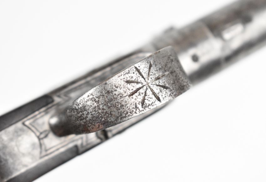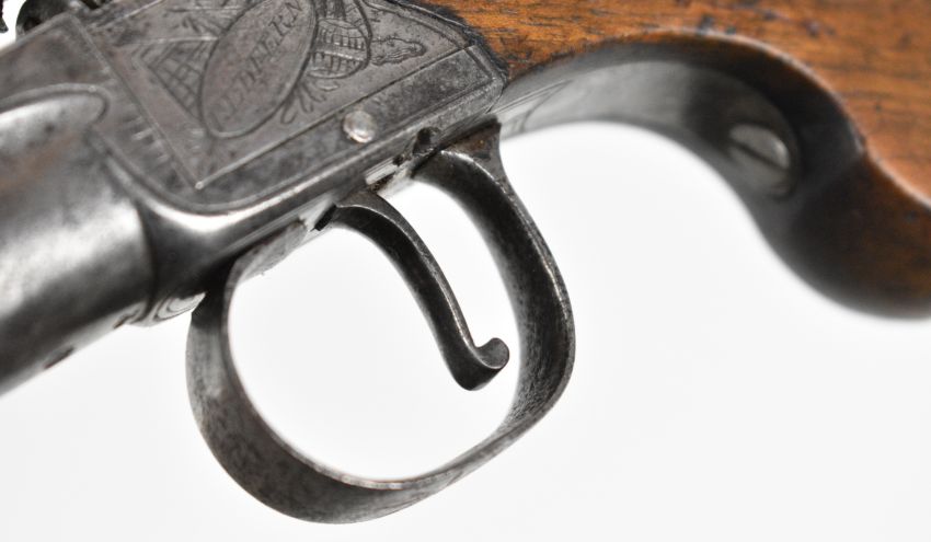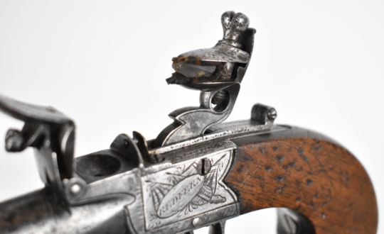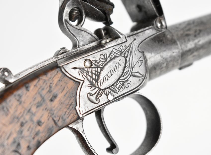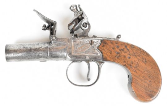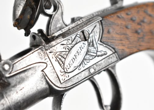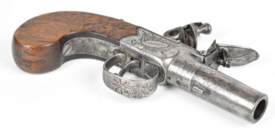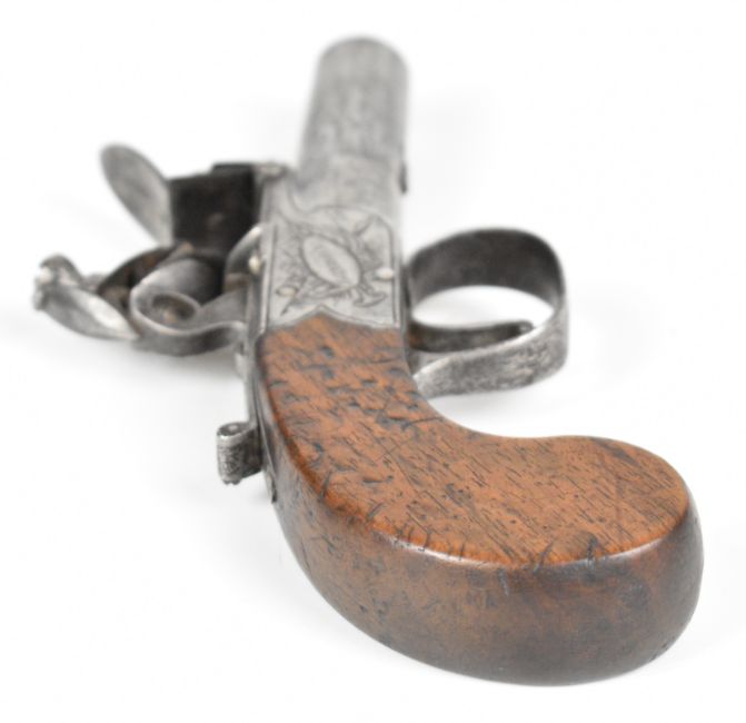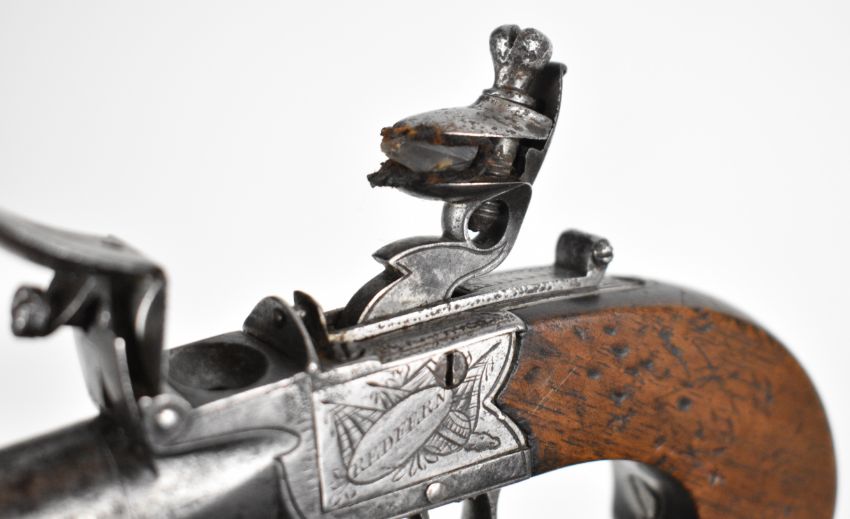 Redfern of London flintlock pocket pistol with named and engraved lock, engraved trigger guard, hammer and thumb slide safety, shaped wooden grips and 2 inch turn-off smooth bored barrel, overall length 15cm.