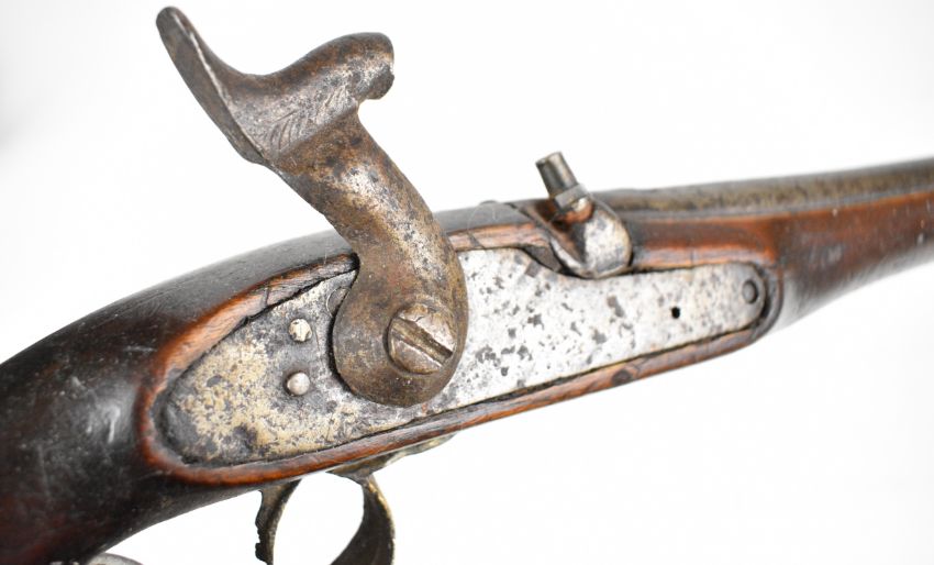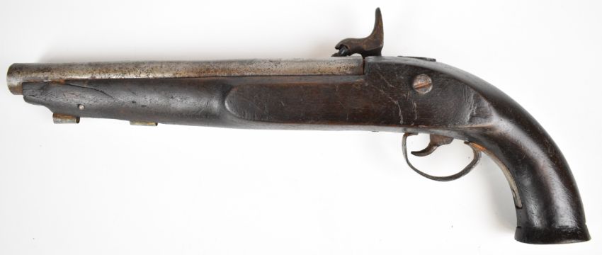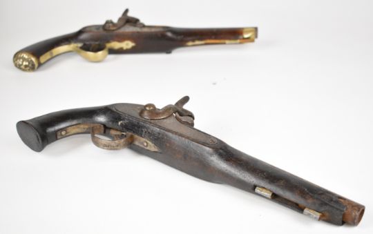 Two Enfield pattern percussion hammer action pistols, one with white metal trigger guard, lion mask butt cap and 8 inch smooth bored barrel, the other with 9 inch smooth bored barrel.