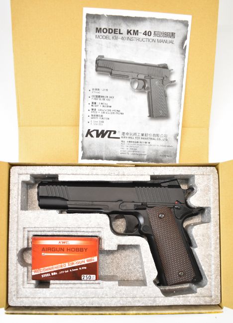 KWC M45 A1 .177 COair pistol with chequered grips and 21 shot magazine, serial number 48016596, in original box with related paperwork and accessories. PLEASE NOTE IF YOU REQUIRE POSTAGE ALL POST 1939 AIR GUNS CAN ONLY BE SENT TO AN RFD.