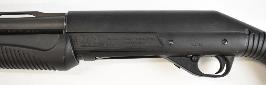Benelli Nova 12 bore 3-shot pump-action shotgun with composite stock, ribbed semi-pistol grip and forend, sling mounts, vented rib and 28 inch multi-choke barrel, overall length 125.5cm, length of pull 36cm, serial number Z141840. PLEASE NOTE THAT A VALID RELEVANT SHOTGUN CERTIFICATE IS REQUIRED TO VIEW OR PURCHASE THIS LOT AND FOR ALL SHOTGUNS OR RIFLES PLEASE ENSURE YOU HAVE THE RELEVANT CERTIFICATE BEFORE BIDDING.