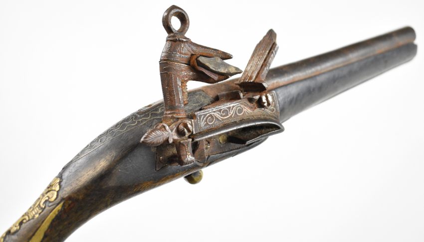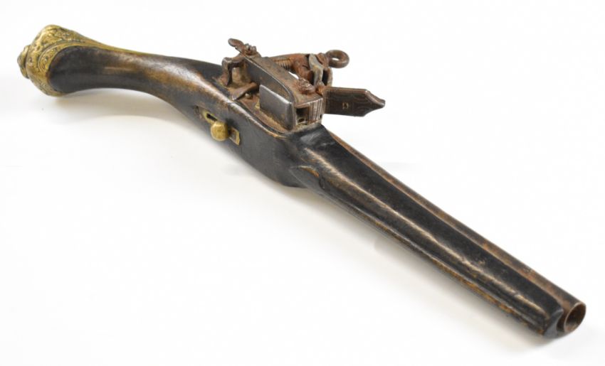 Roman type flintlock pistol with embossed brass butt cap, silver wire inlaid decoration to the lock, hammer and stock, ornate wrist cartouche and 9 inch smooth bored barrel, overall length 42cm.