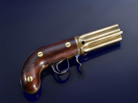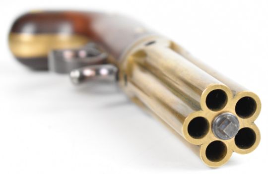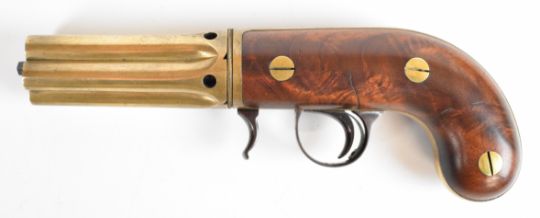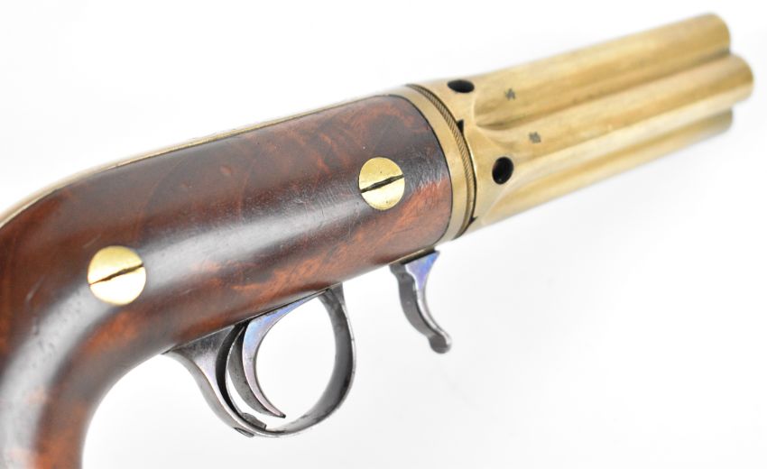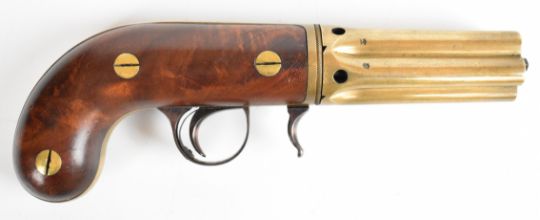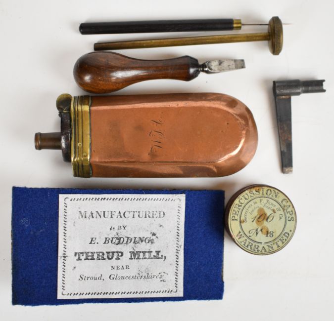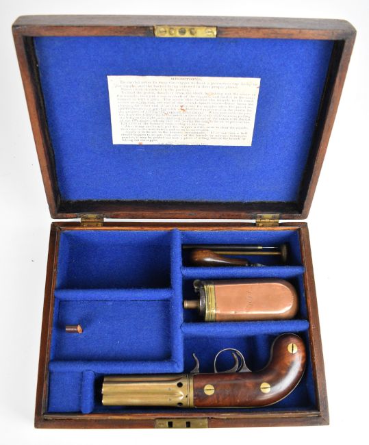 Edwin Budding of Thrup Mill Stroud 140 bore Buddings Patent third model five-shot percussion pepperbox revolver with brass frame signed 'Budding Maker' in oval cartouche with engraved scrolls, exposed iron cocking lever, shaped walnut grips and 3.25 inch hand-rotated brass barrels, overall length 21cm, serial number 3, in fitted wooden case with powder flask and accessories.