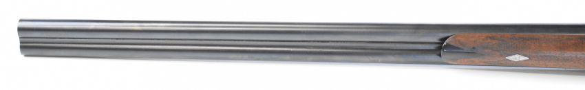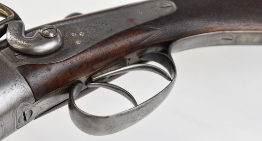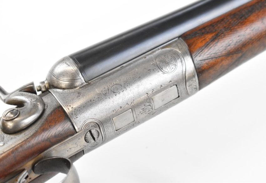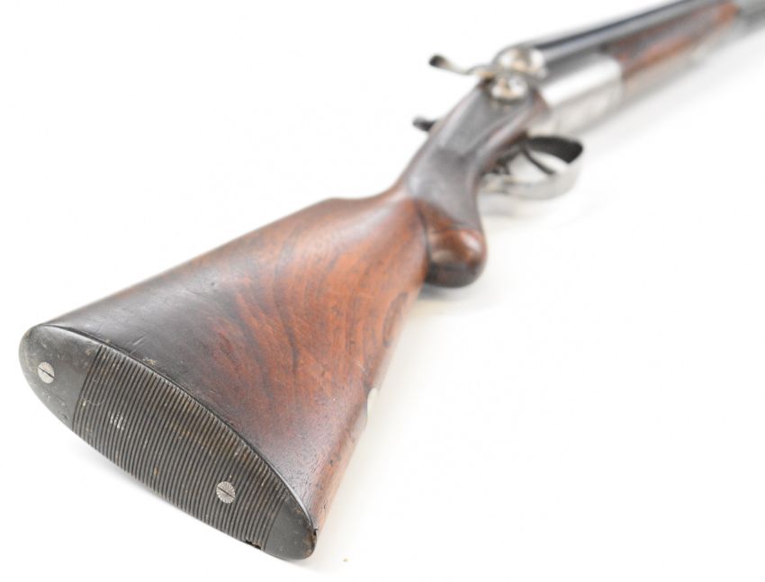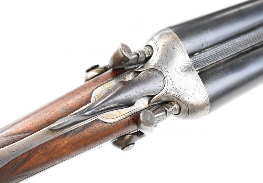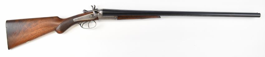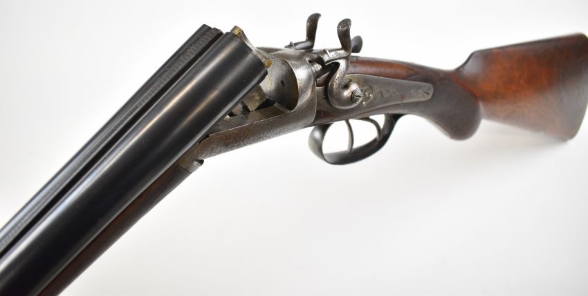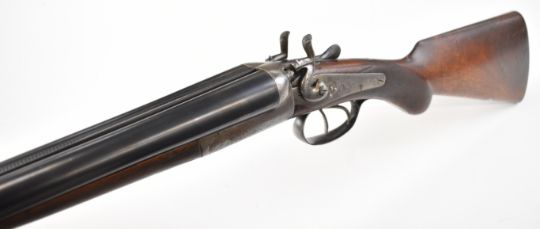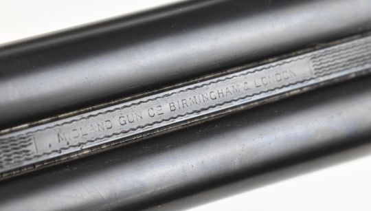 Midland Gun Co 12 bore side by side hammer action shotgun with engraved locks, hammers, underside, trigger guard, top plate, thumb lever and fences, chequered semi-pistol grip and horn tipped forend, vacant cartouche to the underside of the stock, double trigger and named 26.5 inch barrels choked cylinder, overall length 118cm, length of pull 35cm, serial number 824959. PLEASE NOTE THAT A VALID RELEVANT SHOTGUN CERTIFICATE IS REQUIRED TO VIEW OR PURCHASE THIS LOT AND FOR ALL SHOTGUNS OR RIFLES PLEASE ENSURE YOU HAVE THE RELEVANT CERTIFICATE BEFORE BIDDING.