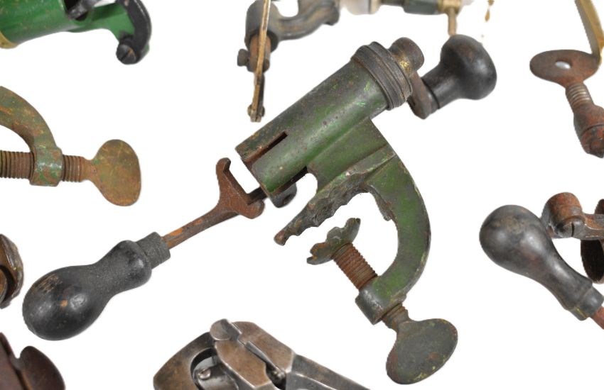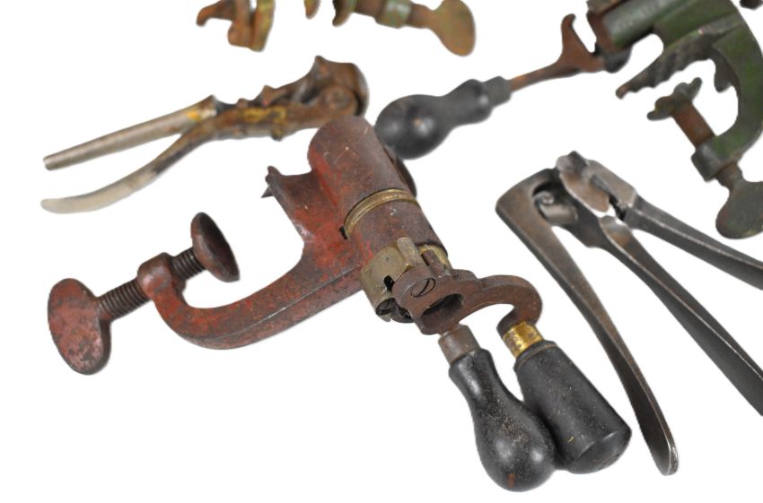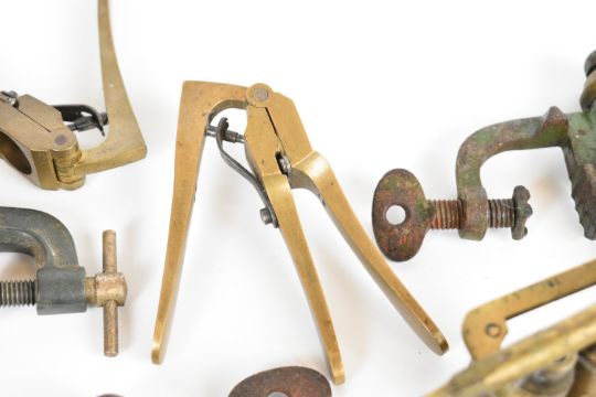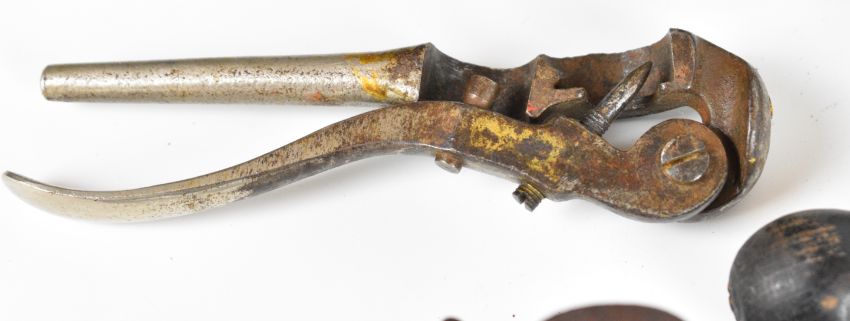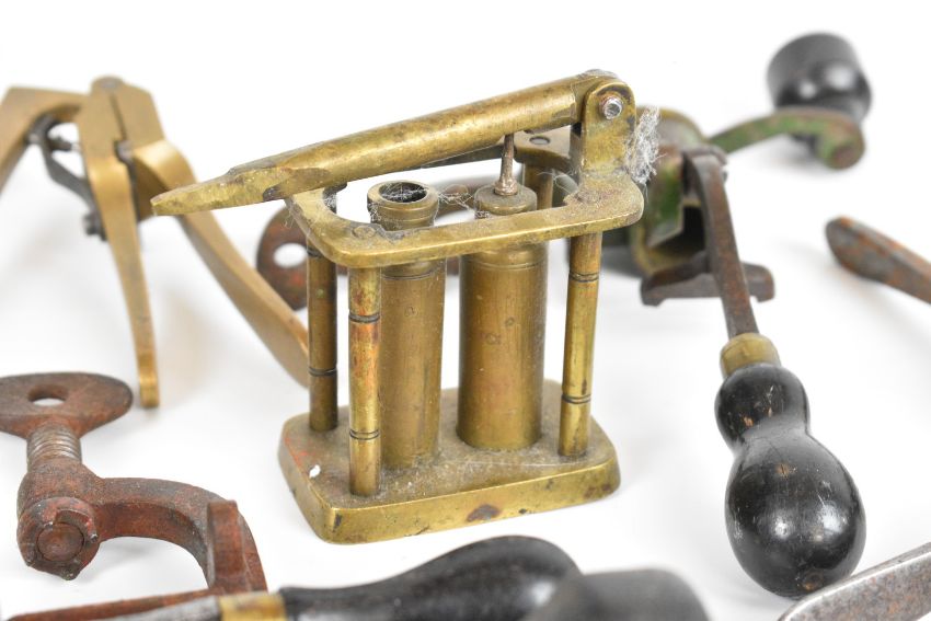Sixteen shotgun cartridge re-loading tools including James Dixon & Sons and G&JW Hawksley roll turnover tools, 12 bore brass capper / de-capper, 16 and 12 bore handheld de-capping tools etc.