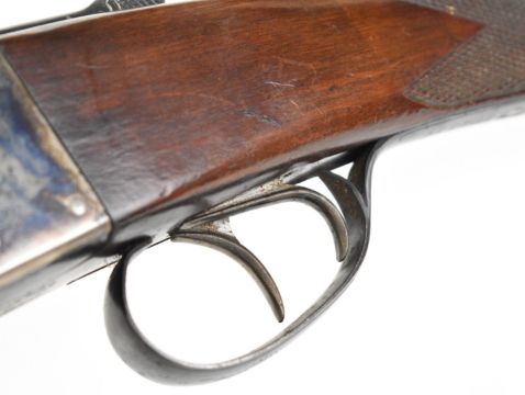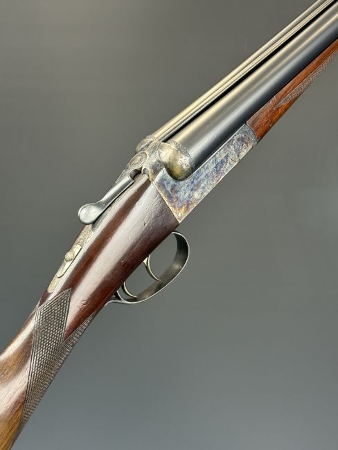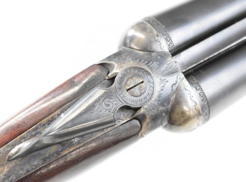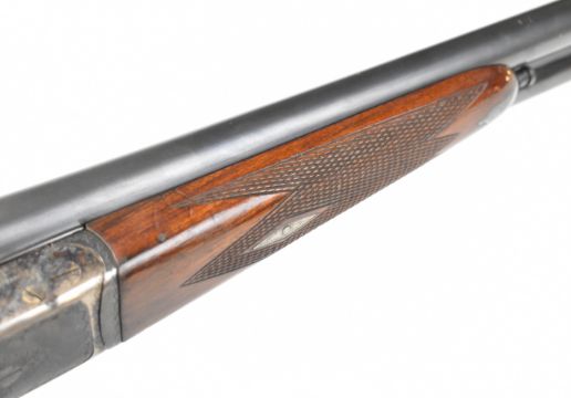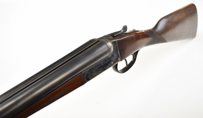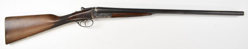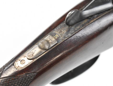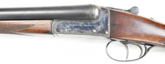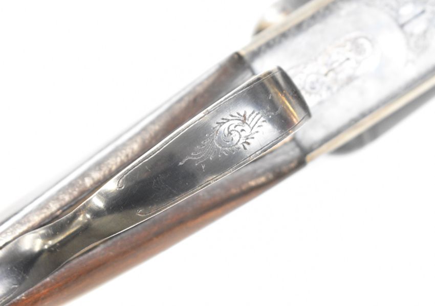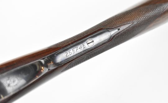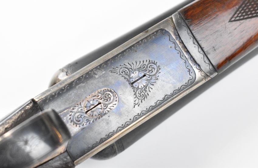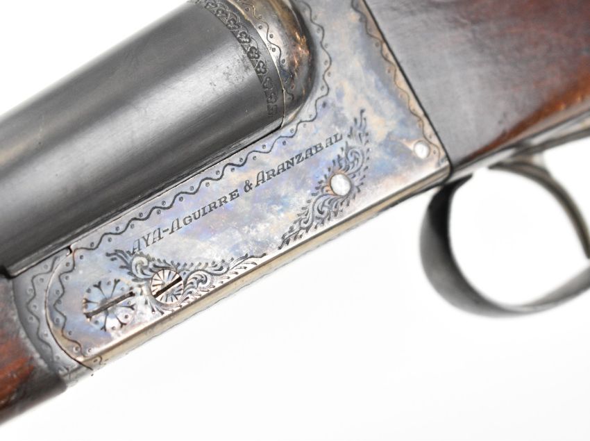 AYA No. 4 12 bore side by side ejector shotgun with named and engraved locks, engraved underside, trigger guard, top plate, thumb lever and fences, chequered grip and forend, vacant cartouche to the underside of the stock, double trigger and named 26 inch barrels choked ½ and cylinder, overall length 109.5cm, length of pull 37cm, serial number 255745. PLEASE NOTE THAT A VALID RELEVANT SHOTGUN CERTIFICATE IS REQUIRED TO VIEW OR PURCHASE THIS LOT AND FOR ALL SHOTGUNS OR RIFLES. PLEASE ENSURE YOU HAVE THE RELEVANT CERTIFICATE BEFORE BIDDING.