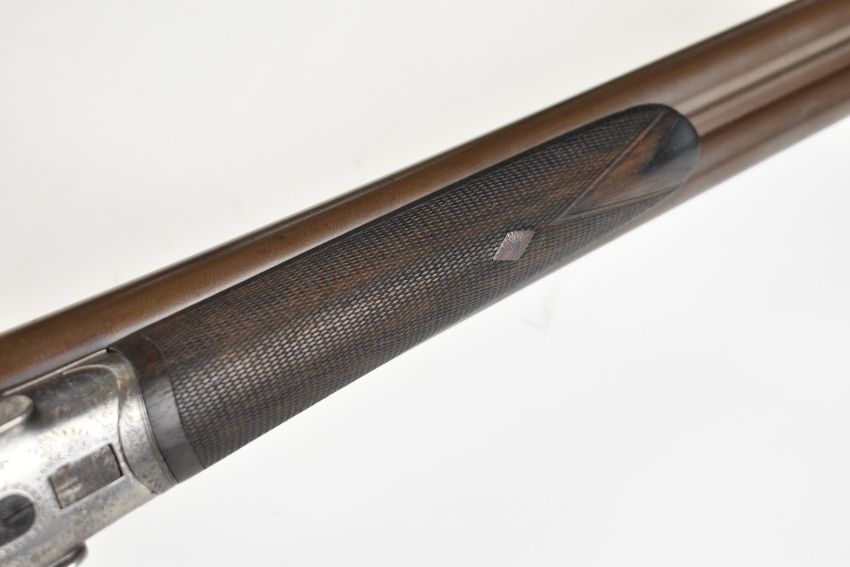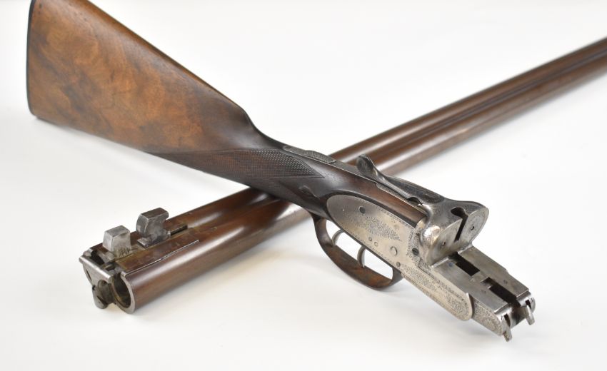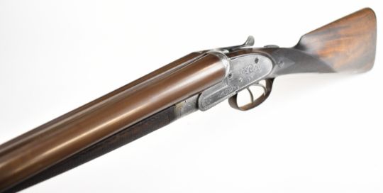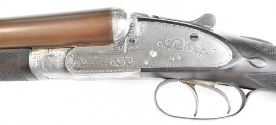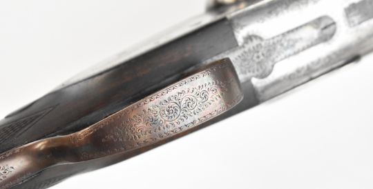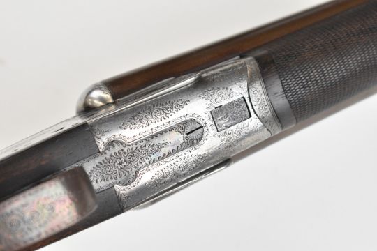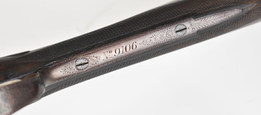 Robert Jones of Liverpool 12 bore sidelock side by side shotgun with named and engraved locks, engraved underside, trigger guard, top plate, thumb lever and fences, chequered grip and forend, carved teardrop to the wrist, vacant cartouche to the underside of the stock, double trigger and named 30 inch Damascus barrels choked ¾ and improved cylinder, overall length 118cm, length of pull 35.5cm, serial number 9106. PLEASE NOTE THAT A VALID RELEVANT SHOTGUN CERTIFICATE IS REQUIRED TO VIEW OR PURCHASE THIS LOT AND FOR ALL SHOTGUNS OR RIFLES PLEASE ENSURE YOU HAVE THE RELEVANT CERTIFICATE BEFORE BIDDING.