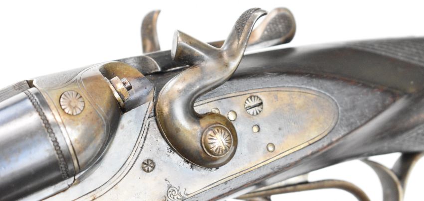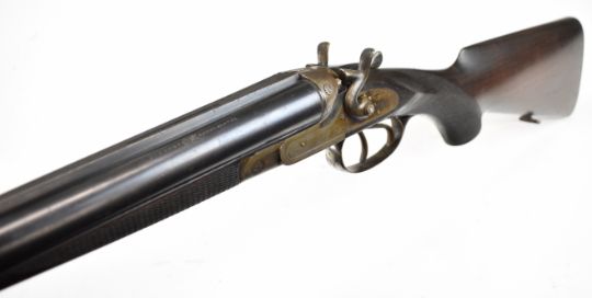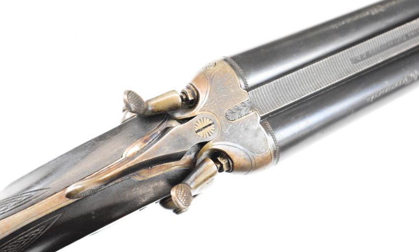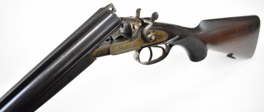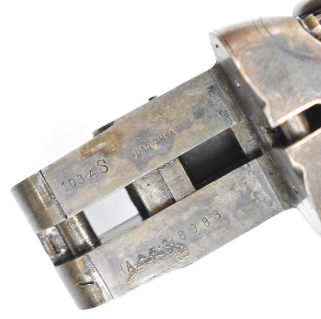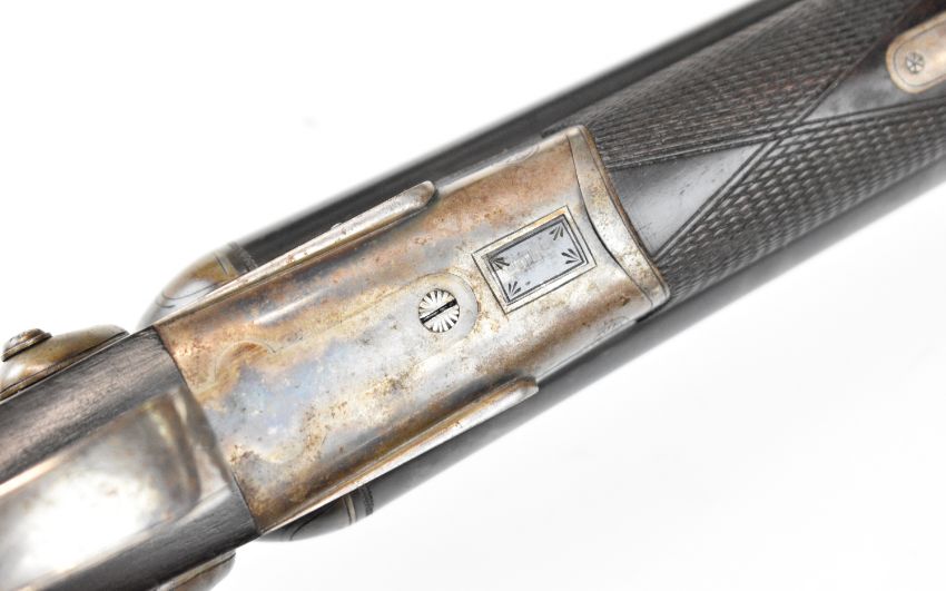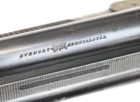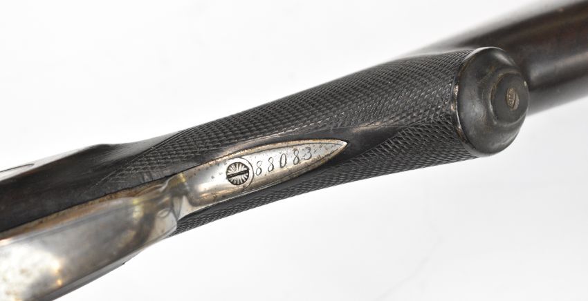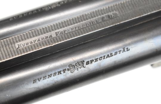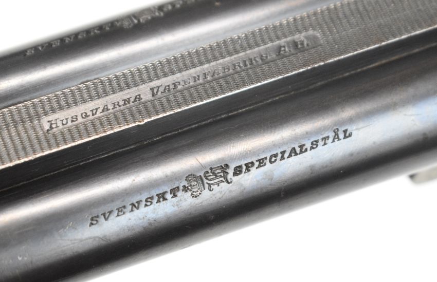 Husqvarna 16 bore side by side hammer action shotgun with line engraved locks, trigger guard, top plate and fences, chequered semi-pistol grip and forend, sling mounts, carved horn butt plate and pistol grip cap and double trigger, length of pull 37.5cm, serial number 88083. By repute formerly the property of Albert Engstrom (1869-1940) Swedish artist, author and member of the Swedish Academy. PLEASE NOTE THAT THIS GUN IS BEING SOLD AS STOCK AND ACTION ONLY AND THAT A VALID RELEVANT RFD CERTIFICATE IS REQUIRED TO VIEW OR PURCHASE THIS LOT.