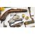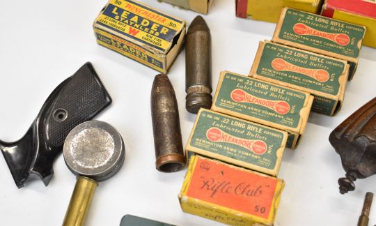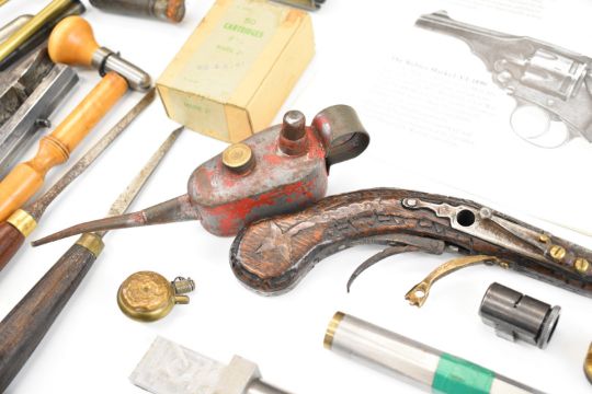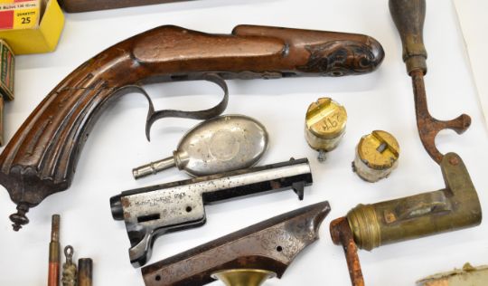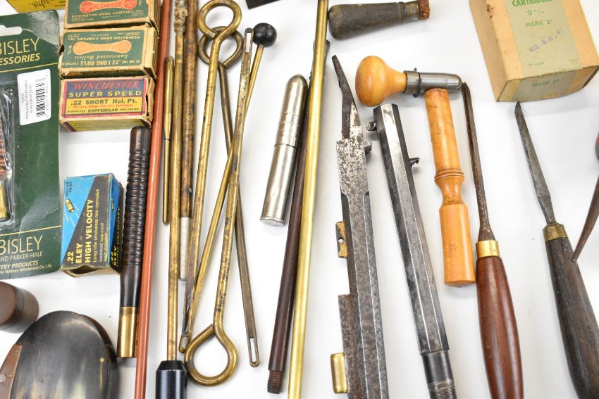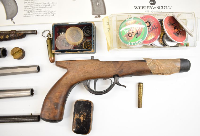 A collection of gun parts and accessories including antique pistol stocks and barrels, cartridge boxes, two Webley posters/ instruction manuals, oil bottles, cleaning kit, re-loading roll turnover tools, Bisley Badges etc