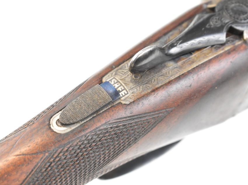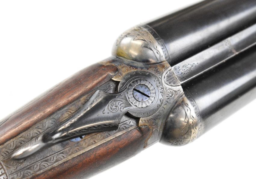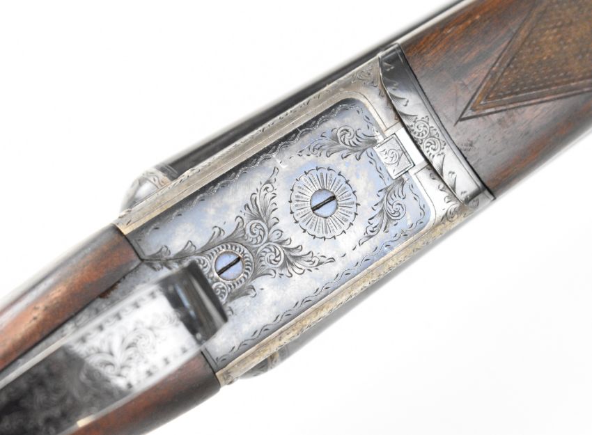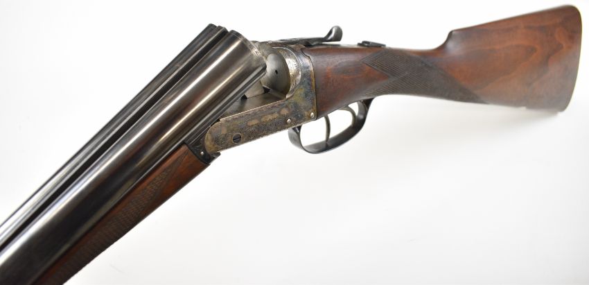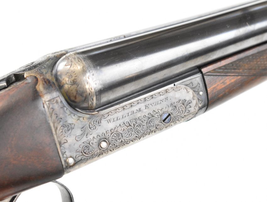 William Evans 12 bore side by side ejector shotgun with named and engraved locks, scrolling engraving to the underside, trigger guard, top plate, thumb lever and fences, chequered grip and forend, vacant cartouche to the underside of the stock, double trigger and named 28 inch barrels choked ½ and ¾, overall length 114cm, length of pull 38cm, serial number 18437, in canvas and leather bound case with fitted interior and with William Evans slip. PLEASE NOTE THAT A VALID RELEVANT SHOTGUN CERTIFICATE IS REQUIRED TO VIEW OR PURCHASE THIS LOT AND FOR ALL SHOTGUNS OR RIFLES PLEASE ENSURE YOU HAVE THE RELEVANT CERTIFICATE BEFORE BIDDING.