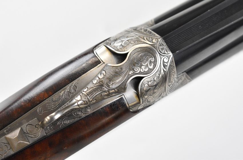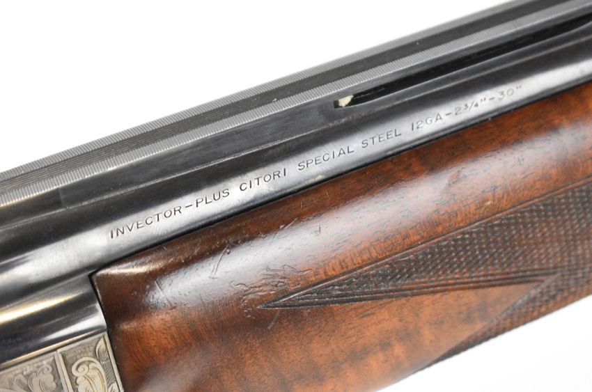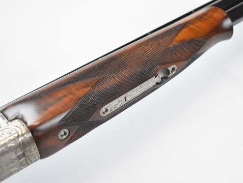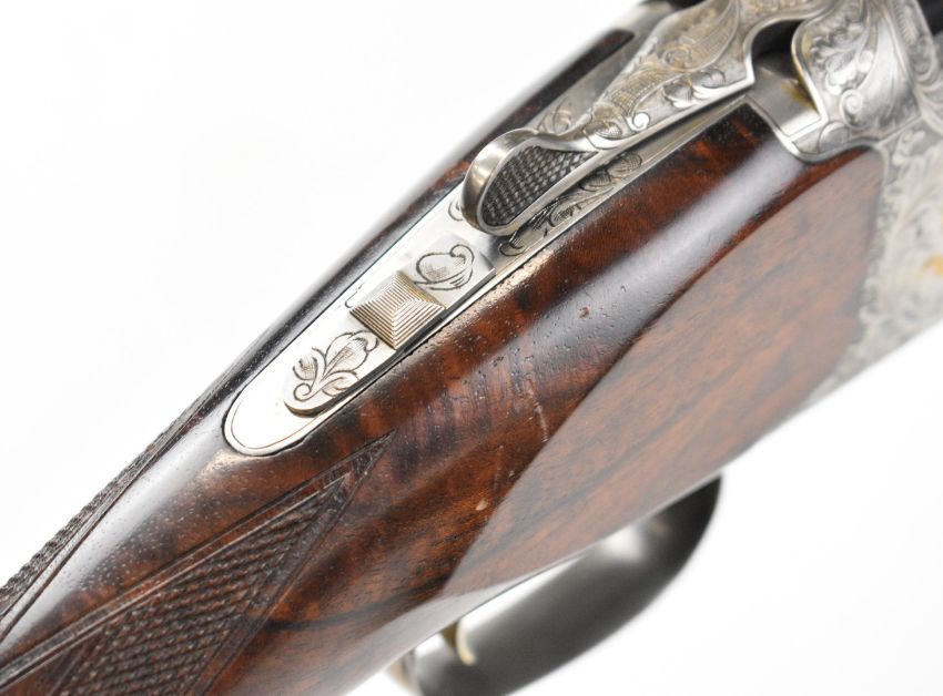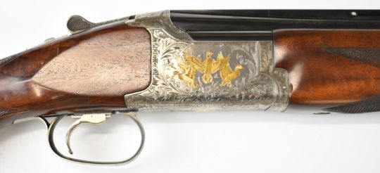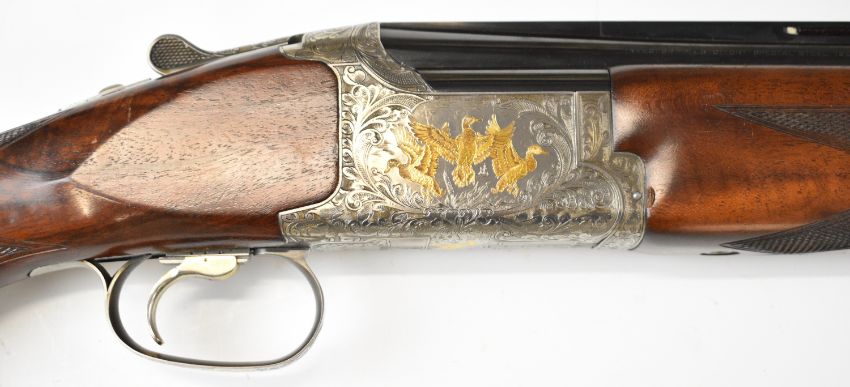 Browning Grade 6 12 bore over and under ejector shotgun with two sets of Teague multi-choke barrels 30 inch and 32 inch, gold inlaid dogs and birds to the engraved action, trigger guard and underside, chequered semi-pistol grip and forend, vacant cartouche to the underside of the stock and adjustable single trigger, length of pull 38cm, serial numbers 27054PP and 27054B. PLEASE NOTE THAT A VALID RELEVANT SHOTGUN CERTIFICATE IS REQUIRED TO VIEW OR PURCHASE THIS LOT AND FOR ALL SHOTGUNS OR RIFLES PLEASE ENSURE YOU HAVE THE RELEVANT CERTIFICATE BEFORE BIDDING.