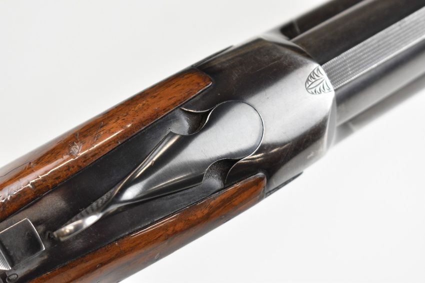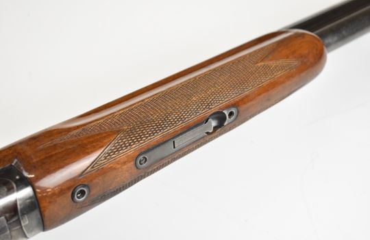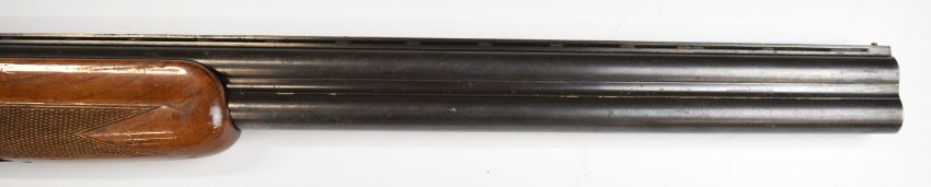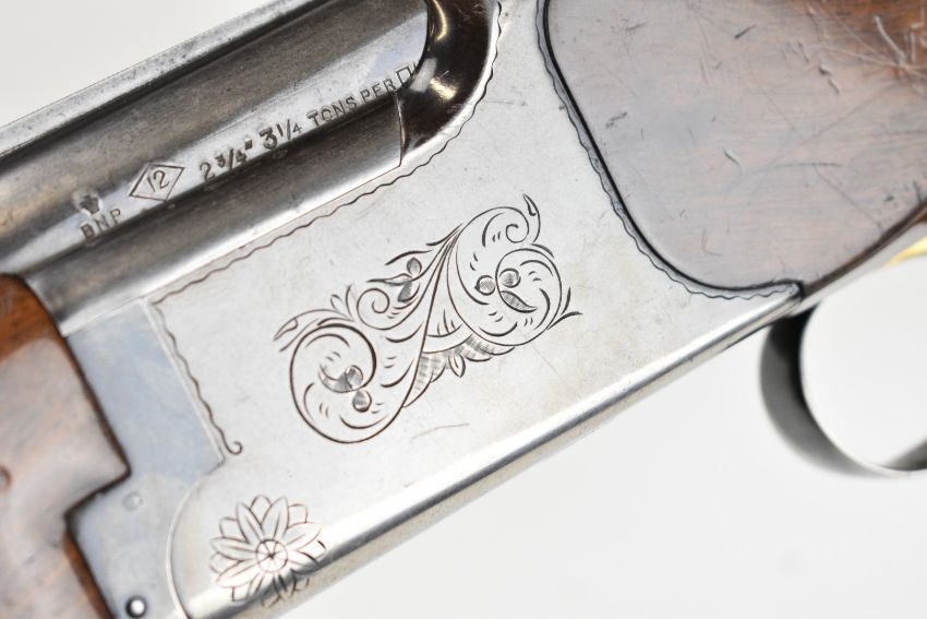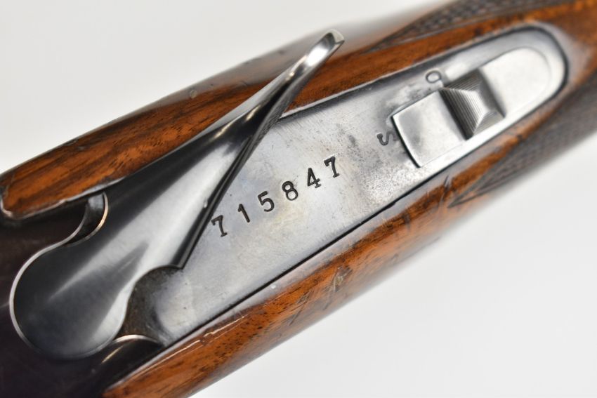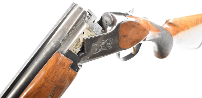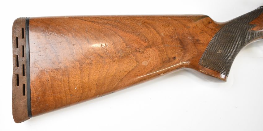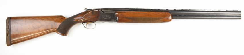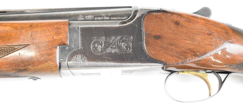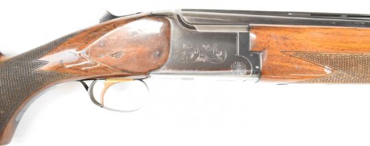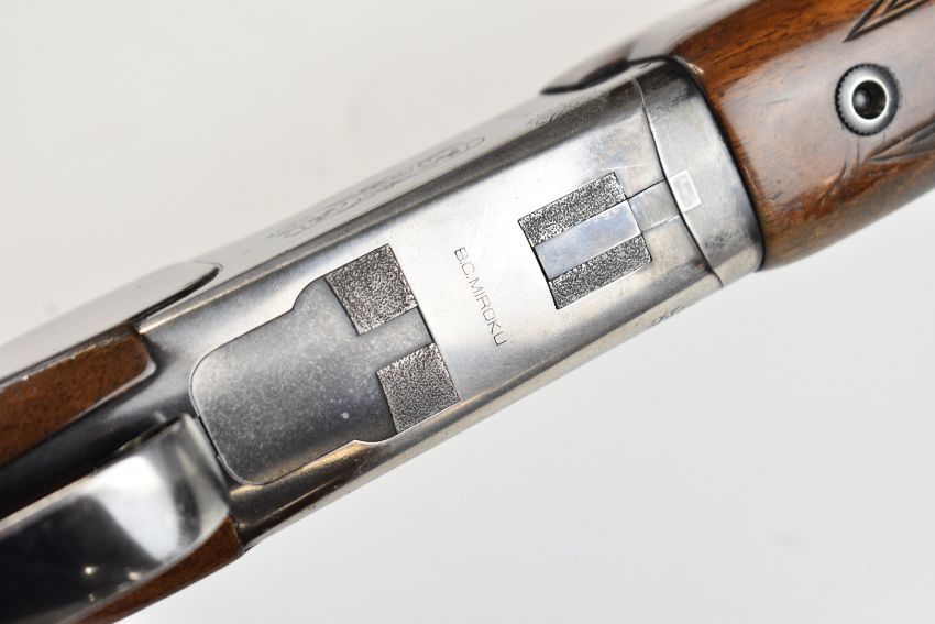 Miroku 12 bore over and under ejector shotgun with engraved action, named underside, chequered semi-pistol grip and forend, single trigger, vented top rib and 26 inch barrels choked improved cylinder, overall length 110cm, length of pull 37cm, serial number 715847. PLEASE NOTE THAT A VALID RELEVANT SHOTGUN CERTIFICATE IS REQUIRED TO VIEW OR PURCHASE THIS LOT AND FOR ALL SHOTGUNS OR RIFLES. PLEASE ENSURE YOU HAVE THE RELEVANT CERTIFICATE BEFORE BIDDING.
