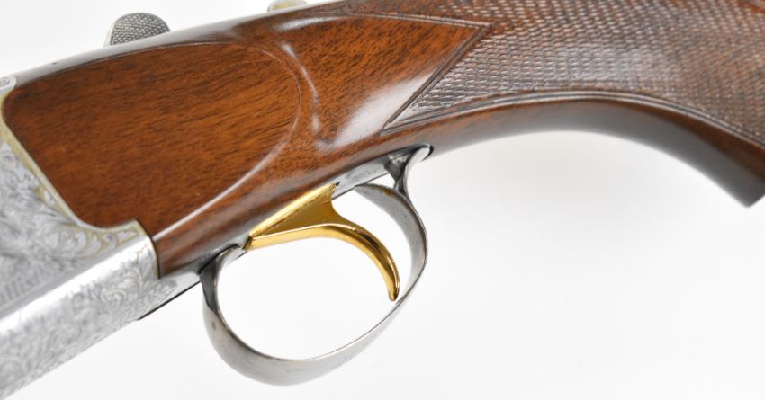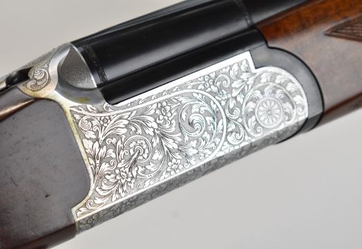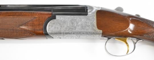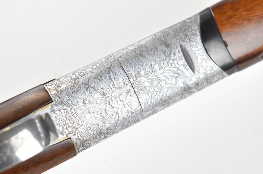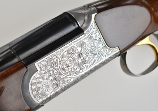 Browning Medallist Sporter 12 bore over and under ejector shotgun with named and ornately engraved locks, underside, trigger guard, top plate and thumb lever, chequered semi-pistol grip and forend, single trigger, vented top and central ribs and 30 inch multi-choke barrels, overall length 120cm, length of pull 36.5cm, serial number 92916, with three additional chokes and choke key. PLEASE NOTE THAT A VALID RELEVANT SHOTGUN CERTIFICATE IS REQUIRED TO VIEW OR PURCHASE THIS LOT AND FOR ALL SHOTGUNS OR RIFLES. PLEASE ENSURE YOU HAVE THE RELEVANT CERTIFICATE BEFORE BIDDING.