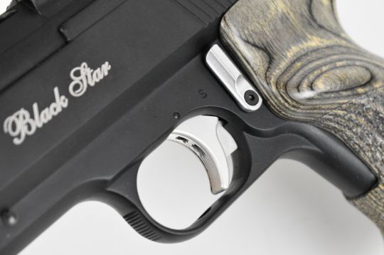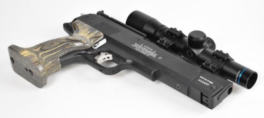 Weihrauch HW45 Black Star .177 air pistol with textured laminate show wood grips, adjustable sights and trigger and PAO 2x20 scope, serial number 442657, in padded hard carry case. PLEASE NOTE IF YOU REQUIRE POSTAGE ALL POST 1939 AIR GUNS CAN ONLY BE SENT TO AN RFD