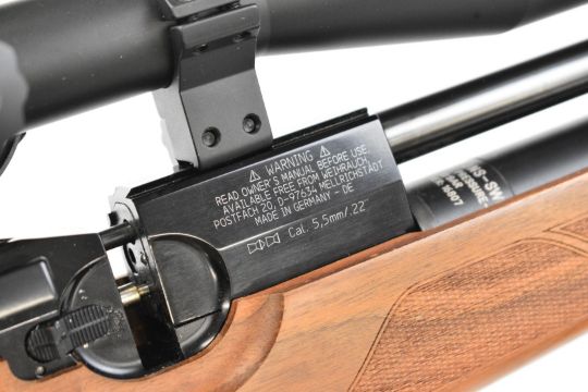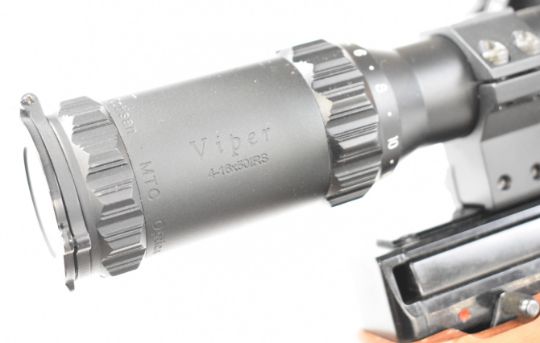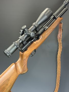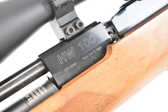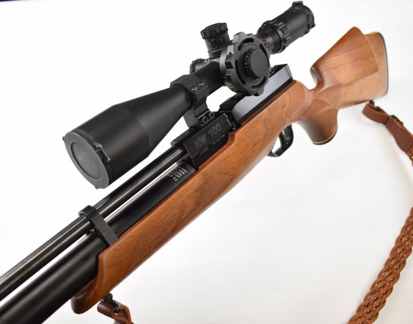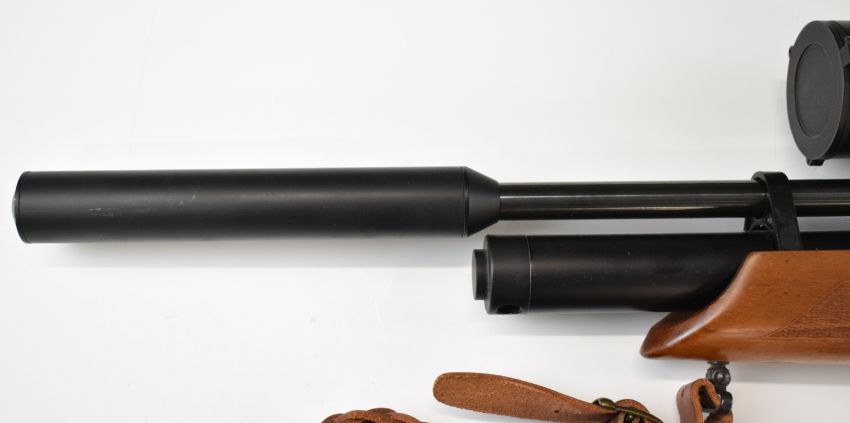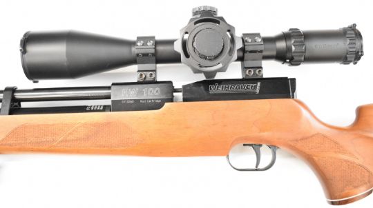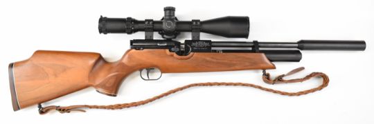 Weihrauch HW100 .22 PCP air rifle with chequered semi-pistol grip and forend, raised cheek piece, adjustable trigger, braided leather sling, sound moderator and Optisan Viper 4-16x50 IRS scope, serial number 1913260. PLEASE NOTE: ALL POST - 1939 AIR GUNS CAN ONLY BE SHIPPED TO AN RFD AND NOT TO A HOME ADDRESS.