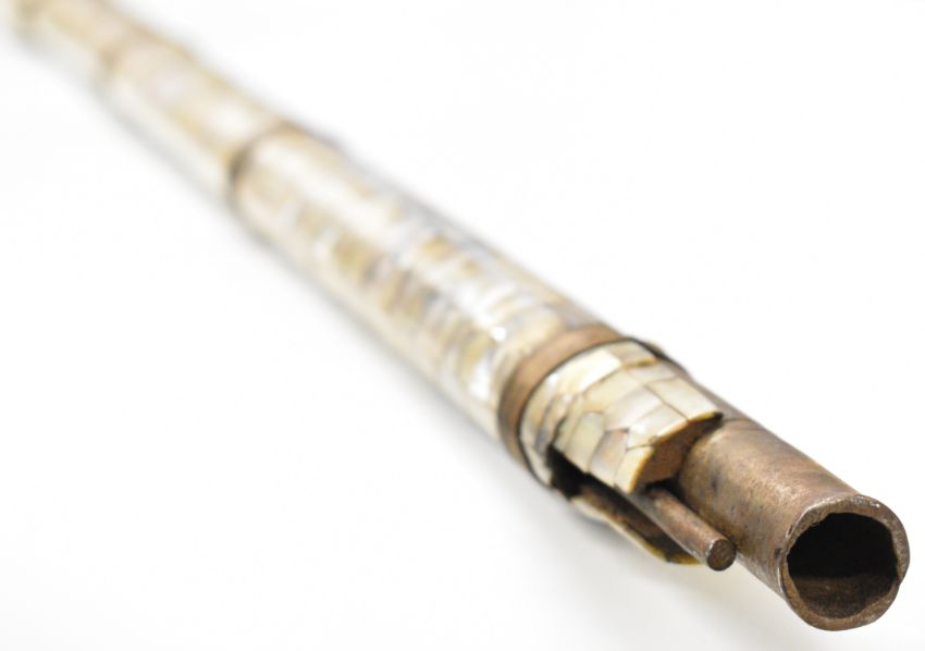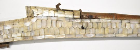 Indian matchlock gun decorated with mother of pearl panels and with brass wire barrel bands and 44.5 inch barrel, overall length 163cm.
