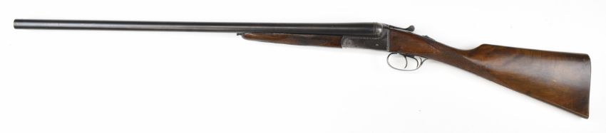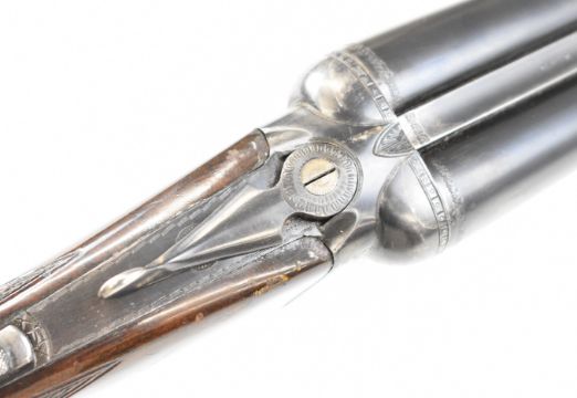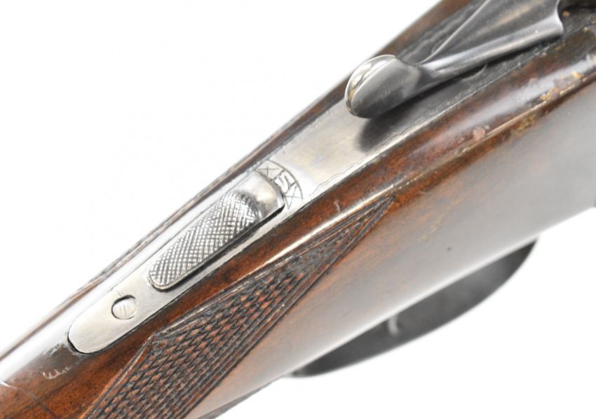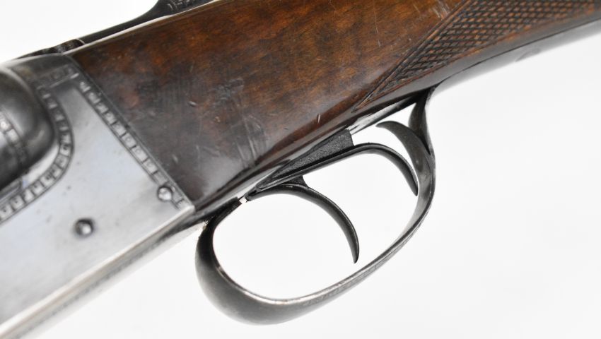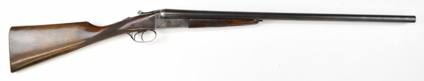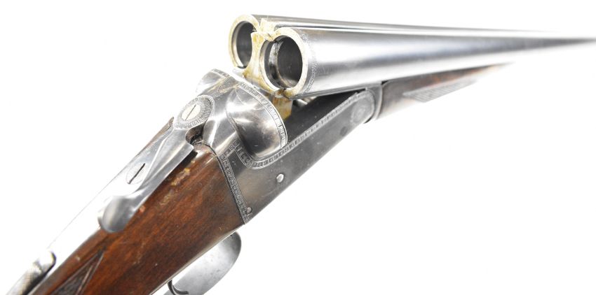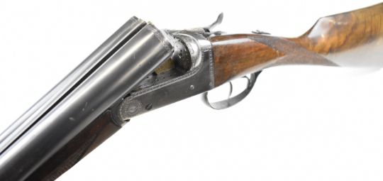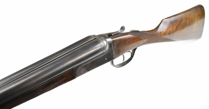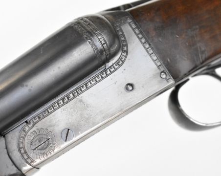 Sabel 12 bore side by side ejector shotgun with border engraved locks, underside, trigger guard, thumb lever and fences, chequered grip and forend, double trigger and 27.5 inch barrels choked improved cylinder and ½, overall length 112cm, length of pull 37cm, serial number 66887. PLEASE NOTE THAT A VALID RELEVANT SHOTGUN CERTIFICATE IS REQUIRED TO VIEW OR PURCHASE THIS LOT AND FOR ALL SHOTGUNS OR RIFLES PLEASE ENSURE YOU HAVE THE RELEVANT CERTIFICATE BEFORE BIDDING.