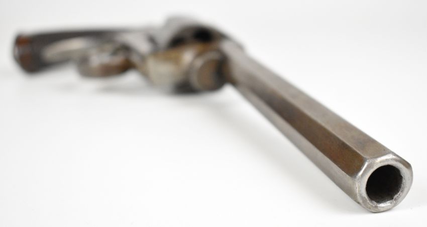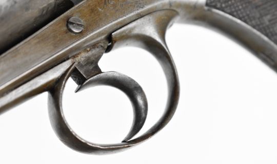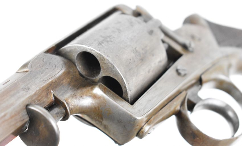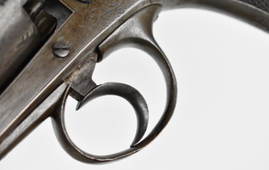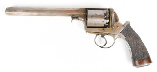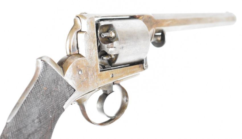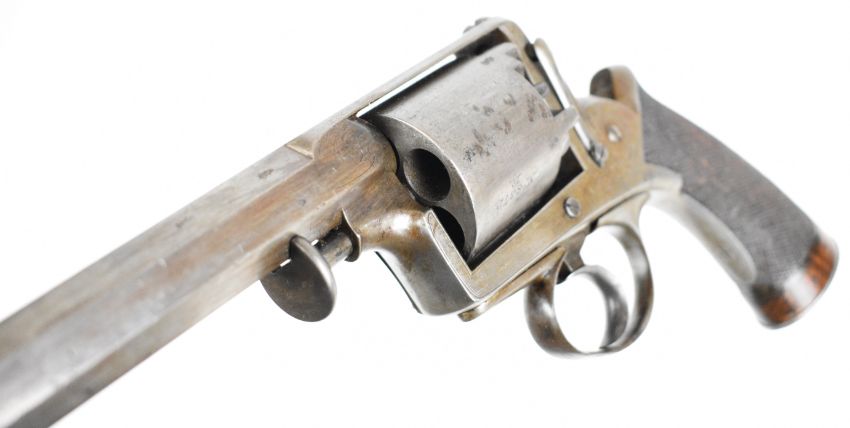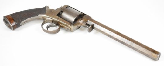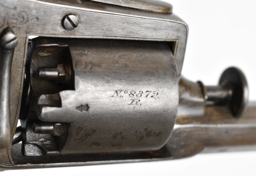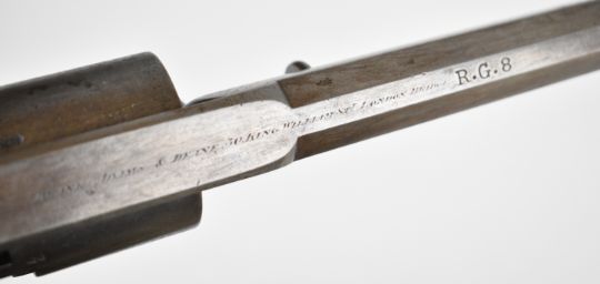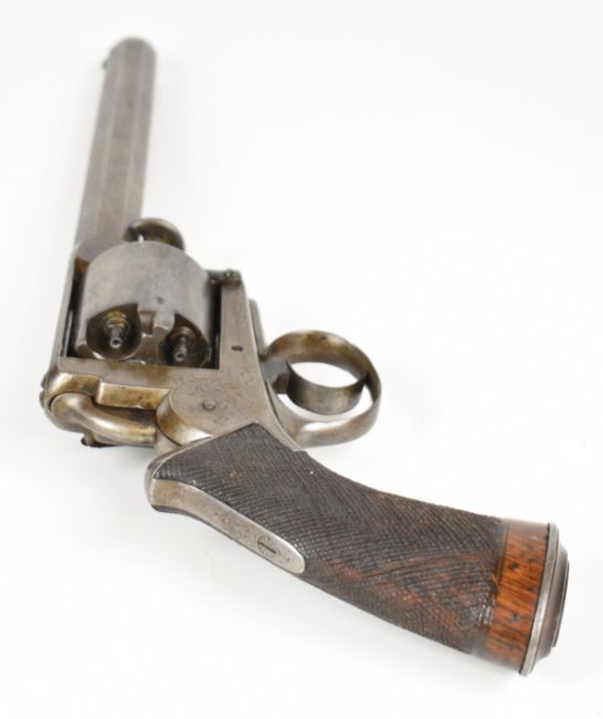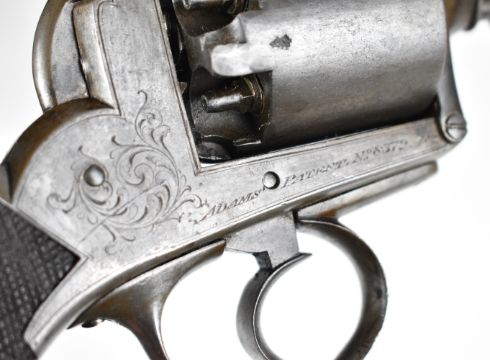Deane, Adams & Deane Adam's patent 5-shot self-cocking semi-hammerless revolver with engraved frame, trigger guard and butt plate, chequered wooden grips and 7.75 inch rifled octagonal barrel engraved 'Deane Adams & Deane, 30, King William STt London Bridge R.G.8.', overall length 37cm, serial number 8372 R.