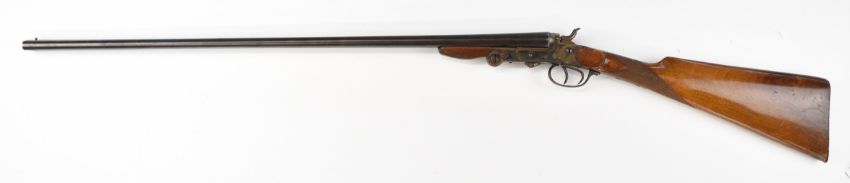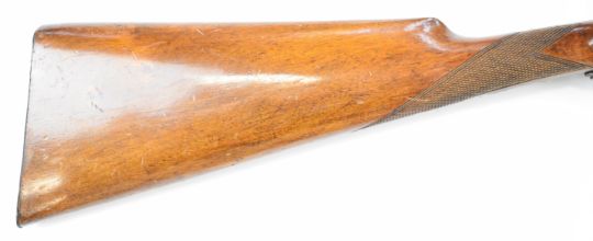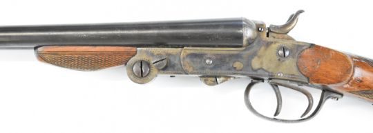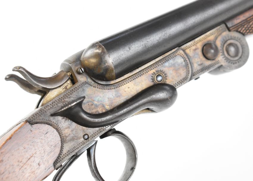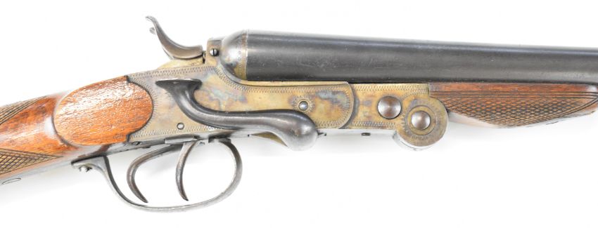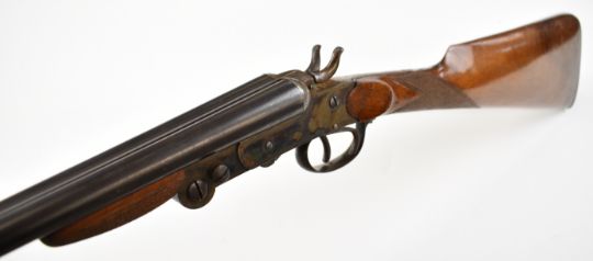 Belgian .410 side by side hammer action folding poacher's shotgun with chequered grip and forend, double trigger and 27.5 inch barrels, overall length 109cm, length of pull 36.5cm, serial number 10. PLEASE NOTE THAT A VALID RELEVANT SHOTGUN CERTIFICATE IS REQUIRED TO VIEW OR PURCHASE THIS LOT AND FOR ALL SHOTGUNS OR RIFLES. PLEASE ENSURE YOU HAVE THE RELEVANT CERTIFICATE BEFORE BIDDING.