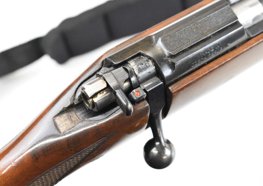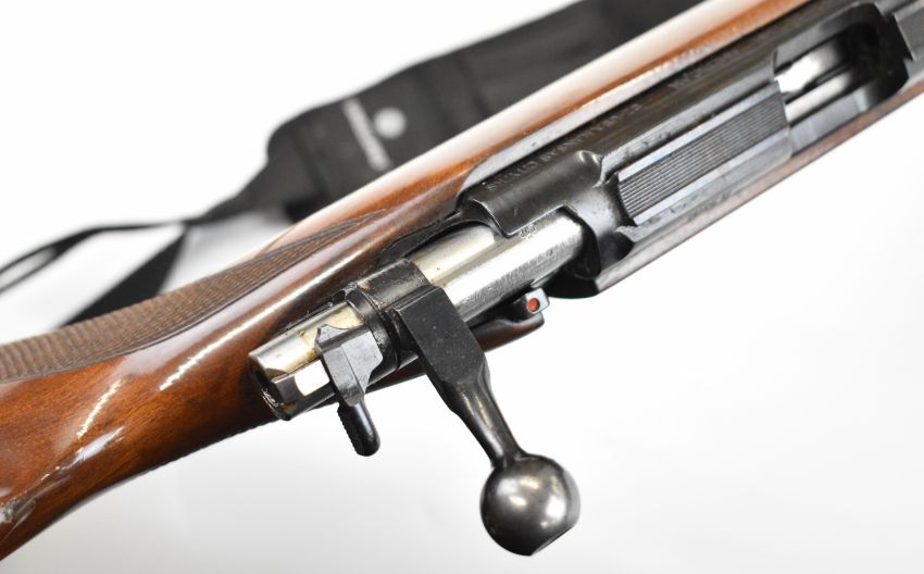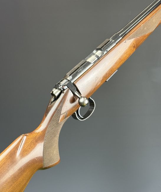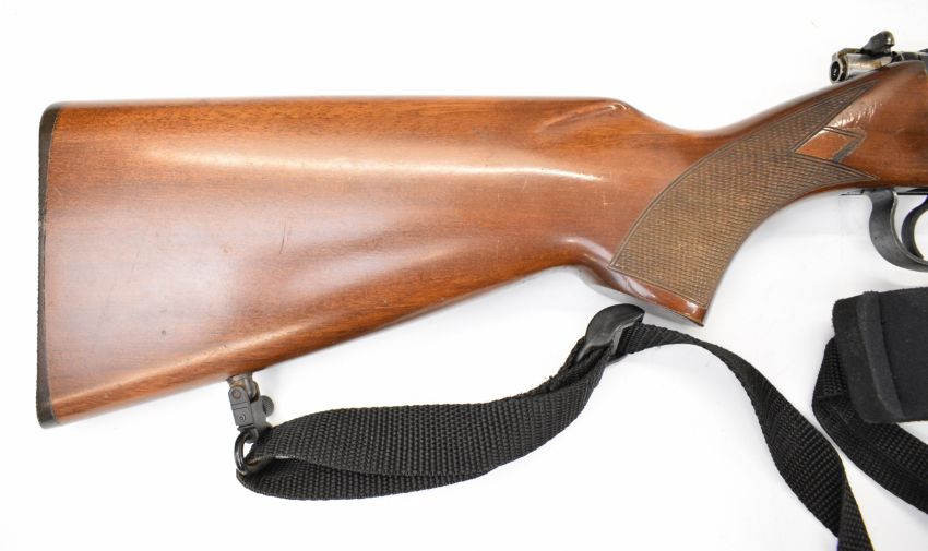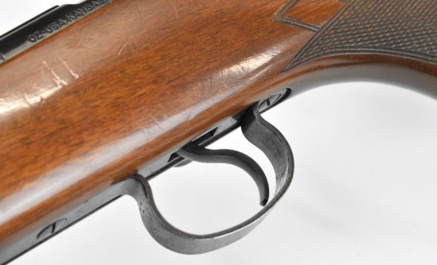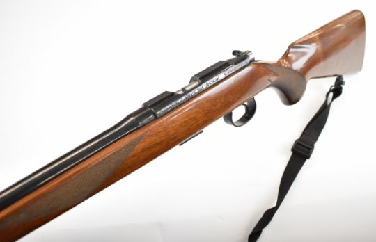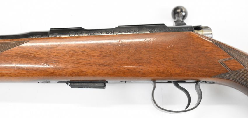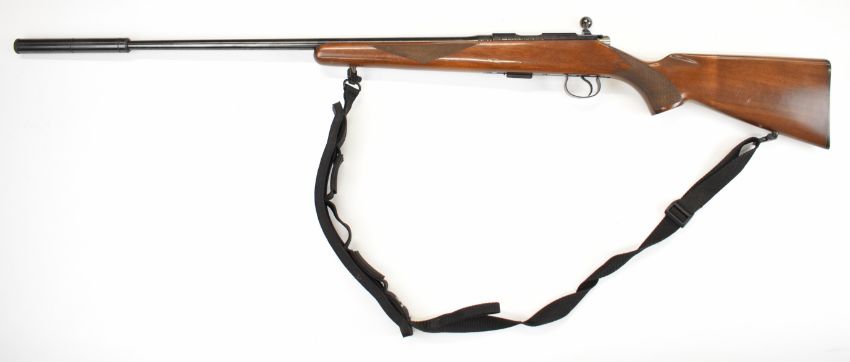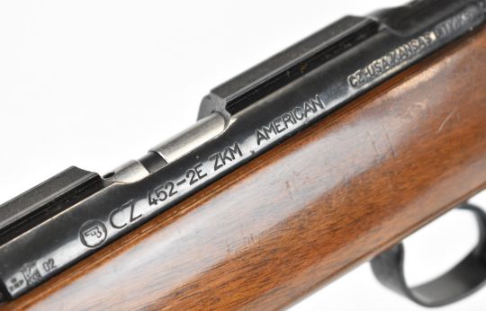 CZ 452-2E ZKM American .22 bolt-action rifle with chequered semi-pistol grip and forend, Vanguard sling, multi-shot magazine, sound moderator and 29 inch barrel, overall length 118.5cm, serial number 825100. PLEASE NOTE THAT A VALID RELEVANT FIREARMS CERTIFICATE IS REQUIRED TO VIEW OR PURCHASE THIS LOT AND FOR ALL SHOTGUNS OR RIFLES. PLEASE ENSURE YOU HAVE THE RELEVANT CERTIFICATE BEFORE BIDDING.