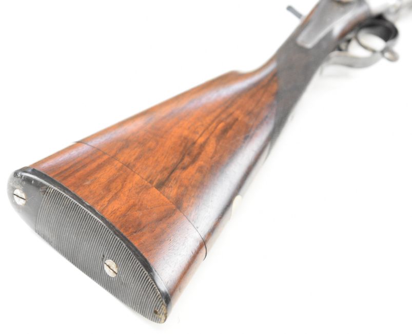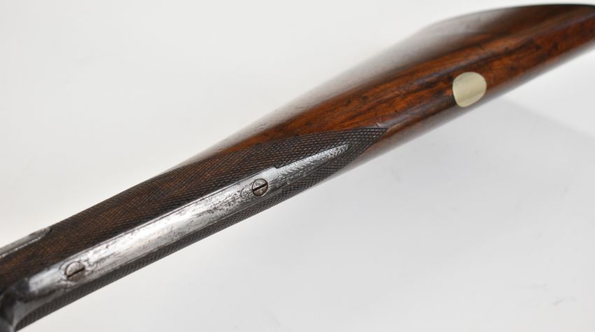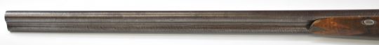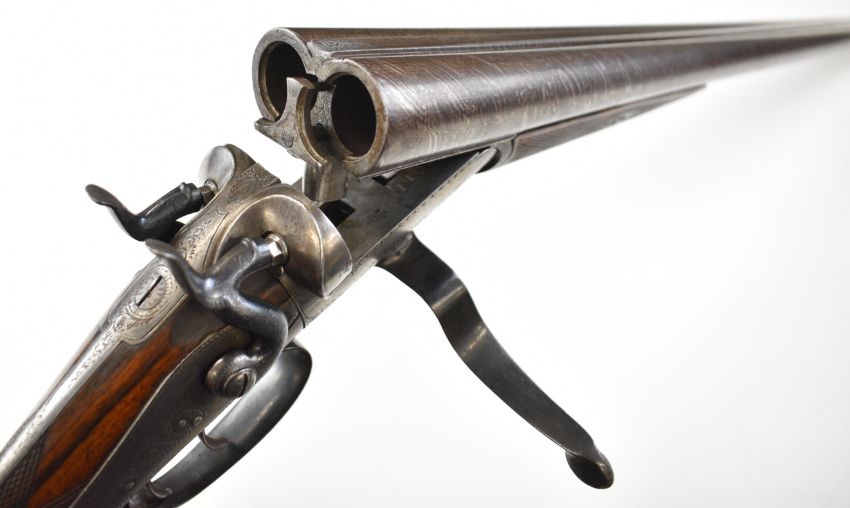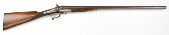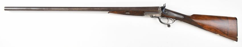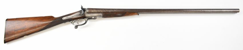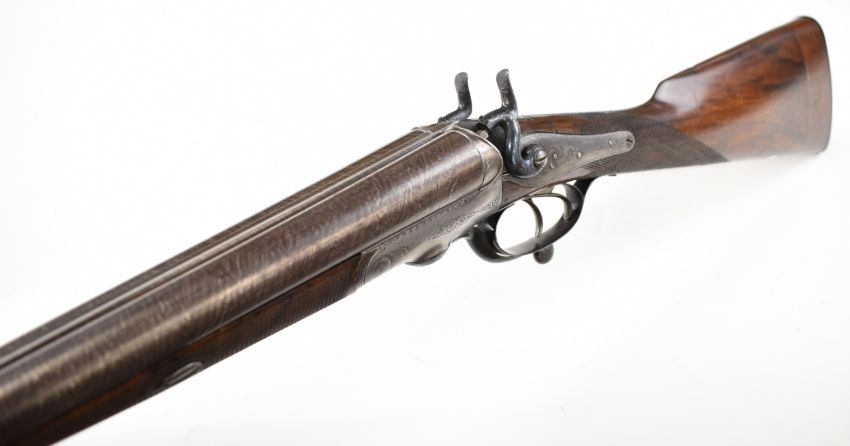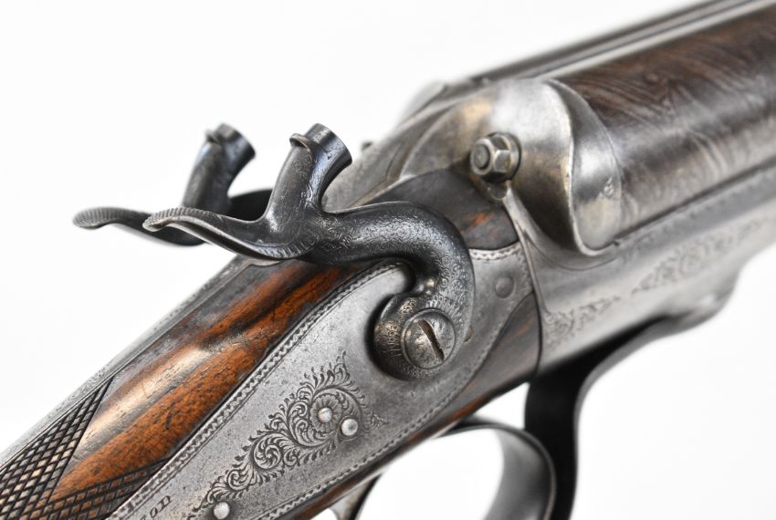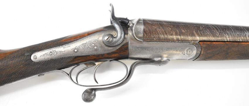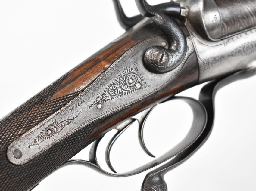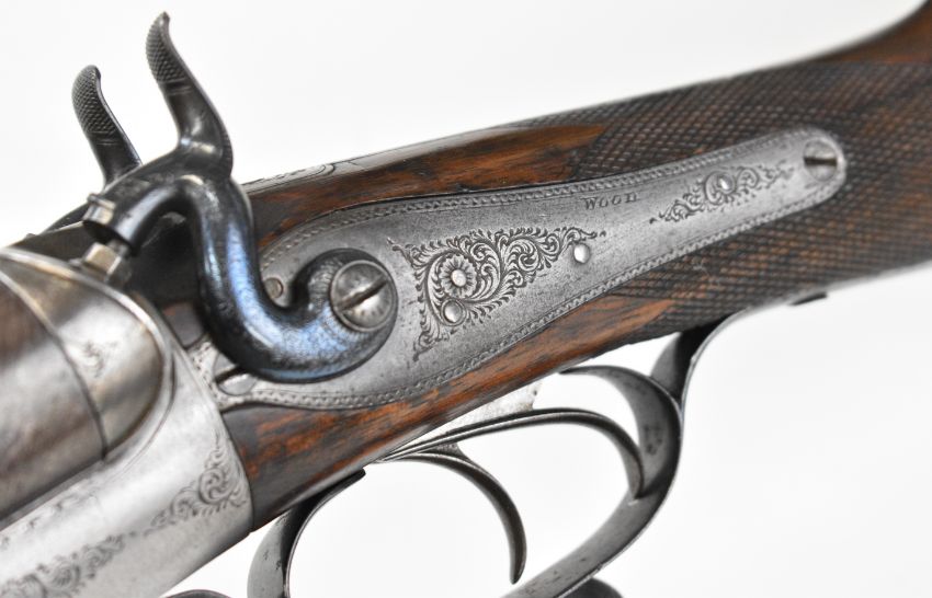 Wood of London 12 bore side by side hammer action shotgun with named and engraved locks, engraved hammers, trigger guard, rotary underlever, underside, top plate and fences, chequered grip and horn tipped forend, vacant cartouche to the underside of the stock, double trigger and named 29.75 inch Damascus barrels choked cylinder and improved cylinder, overall length 118cm, length of pull 36.5cm, serial number 38044PLEASE NOTE THAT A VALID RELEVANT SHOTGUN CERTIFICATE IS REQUIRED TO VIEW OR PURCHASE THIS LOT AND FOR ALL SHOTGUNS OR RIFLES PLEASE ENSURE YOU HAVE THE RELEVANT CERTIFICATE BEFORE BIDDING.