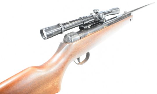 BSA Meteor Mk. I .22 air rifle with semi-pistol grip and BSA 4x20 scope, serial number T4989. PLEASE NOTE: ALL POST - 1939 AIR GUNS CAN ONLY BE SHIPPED TO AN RFD AND NOT TO A HOME ADDRESS.