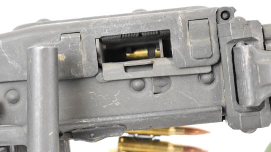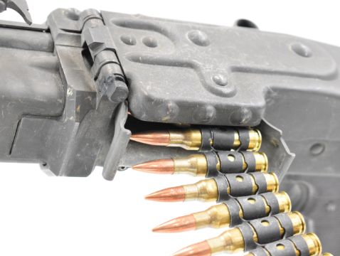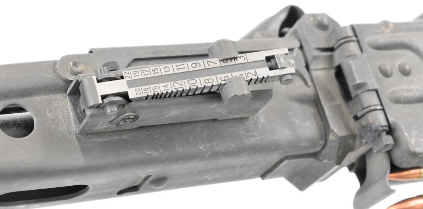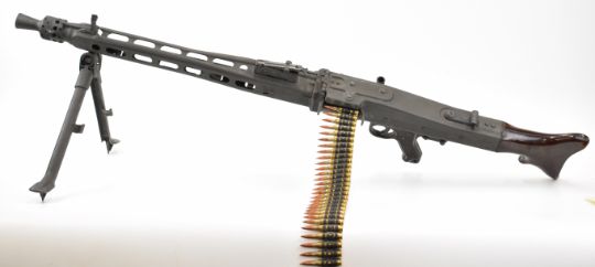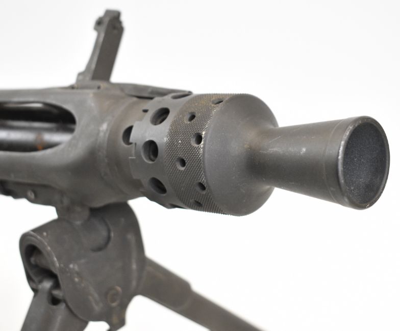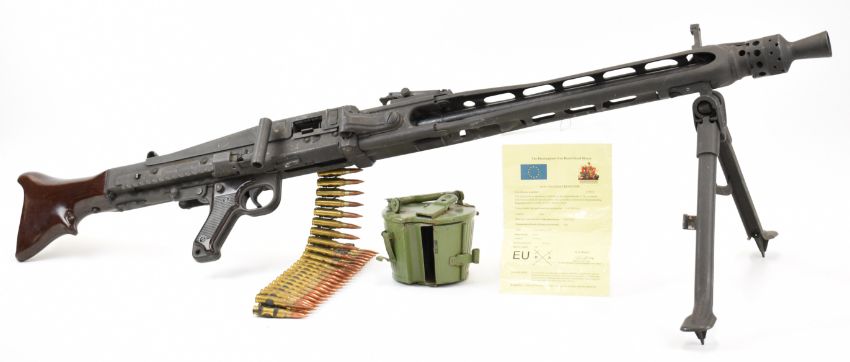 Deactivated Italian MG42 /59 7.62mm NATO light machine gun with frame stamped 'EI 0030400 MH.42/59 Cal 7.62 NATO1968', composite pistol grip and stock, bi-pod, adjustable sights and 26 inch barrel, overall length 121cm, serial number 0030400, with over 50 inert rifle cartridges, drum magazine and deactivation certificate dated 06/03/2023.