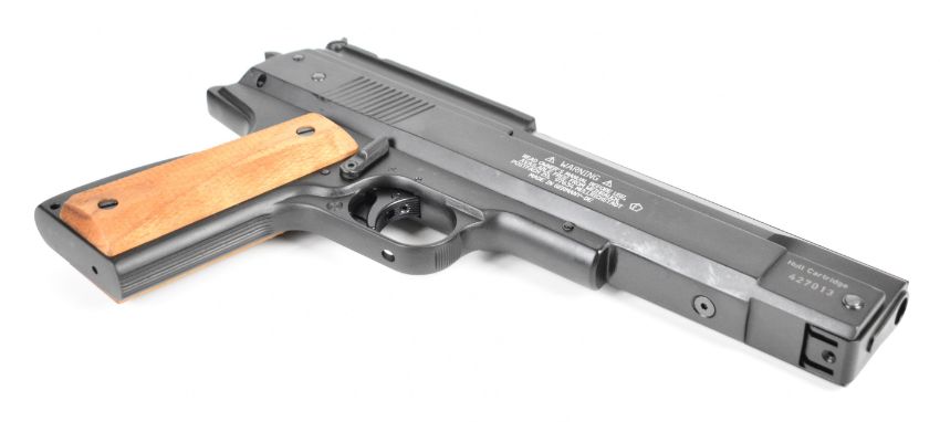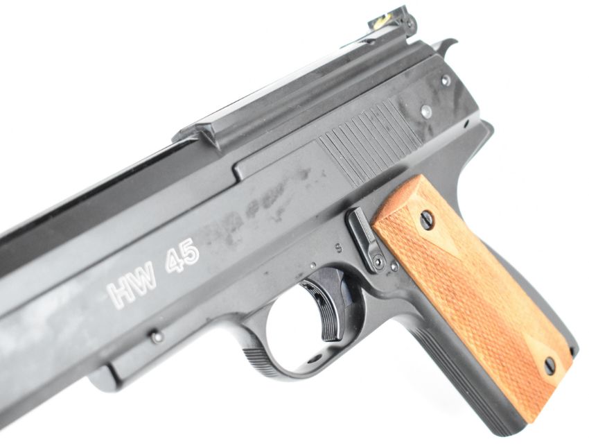 Weihrauch HW45 .22 air pistol with chequered wooden grips and adjustable sights and trigger, serial number 427013, in original box with hang tag, instructions and accessories. PLEASE NOTE IF YOU REQUIRE POSTAGE ALL POST 1939 AIR GUNS CAN ONLY BE SENT TO AN RFD.