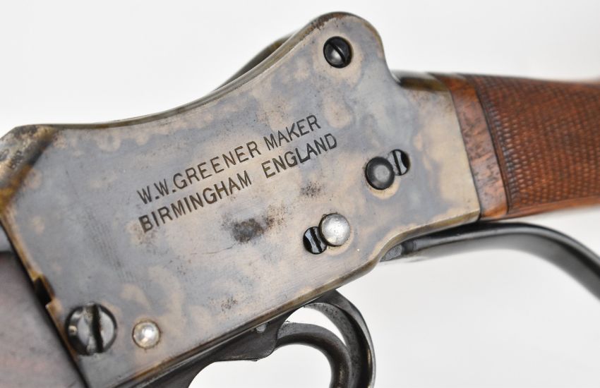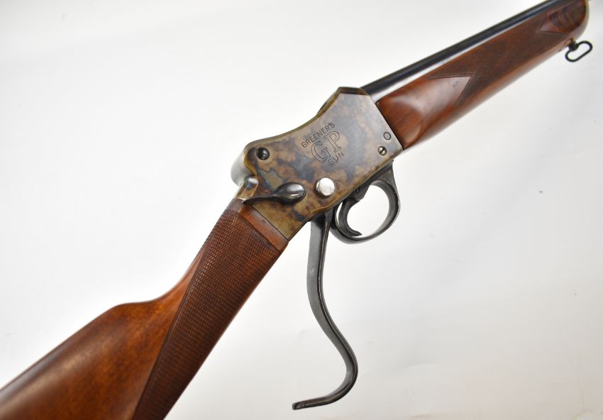 W W Greener Greener's GP Gun Martini underlever action 12 bore single barrelled shotgun with named lock, chequered grip and forend and 26 inch barrel choked ½, overall length 108.5cm, length of pull 37.5cm, serial number R67055. PLEASE NOTE THAT A VALID RELEVANT SHOTGUN CERTIFICATE IS REQUIRED TO VIEW OR PURCHASE THIS LOT AND FOR ALL SHOTGUNS OR RIFLES. PLEASE ENSURE YOU HAVE THE RELEVANT CERTIFICATE BEFORE BIDDING.