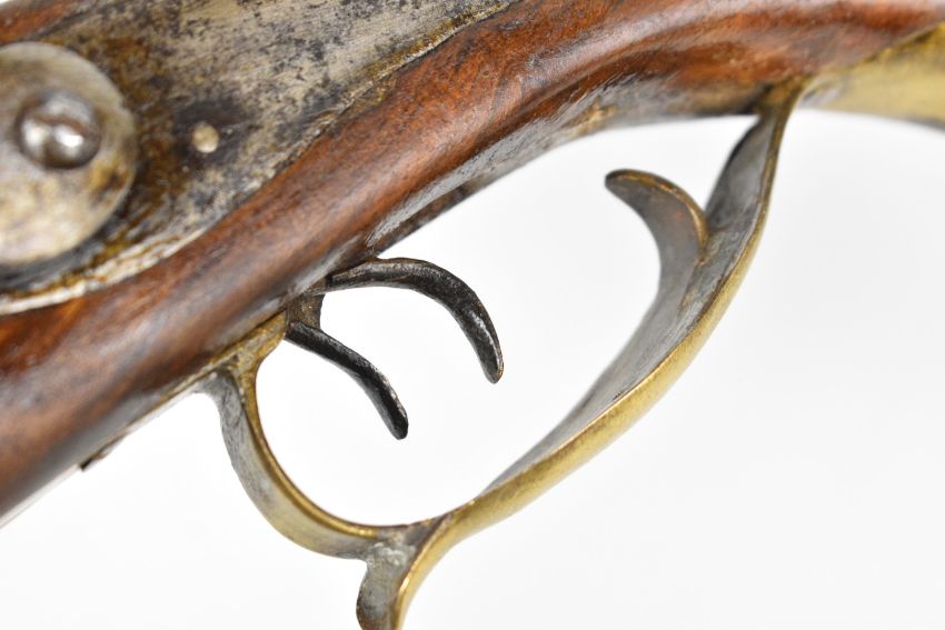 Two percussion hammer action pistols, one a double barrelled side by side howdah pistol with brass trigger guard and butt cap, wooden ram-rod and 12.5 inch barrels, the other with brass lock plate, trigger guard and mounts and 9 inch barrel.