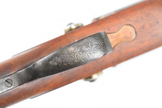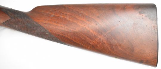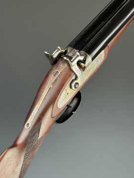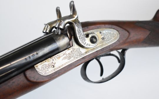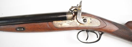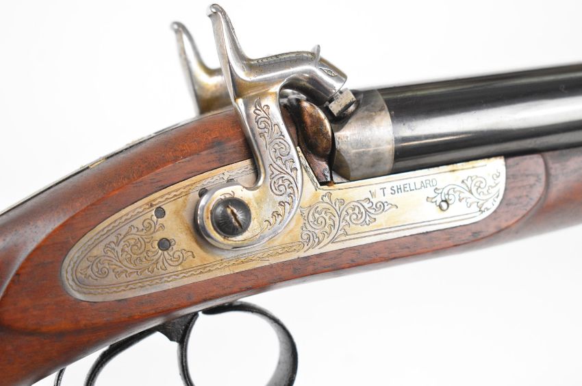 Pietta Navy Arms of Ridgefield New Jersey 12 bore side by side muzzle loading percussion hammer action shotgun with locks engraved 'W T Shellard', engraved locks, stylised dolphin hammers, trigger guard and top strap, chequered grip, brass tipped wooden ramrod, double trigger and named 28 inch barrels, overall length 113cm, serial number 5304. PLEASE NOTE THAT A VALID RELEVANT SHOTGUN CERTIFICATE IS REQUIRED TO VIEW OR PURCHASE THIS LOT AND FOR ALL SHOTGUNS OR RIFLES PLEASE ENSURE YOU HAVE THE RELEVANT CERTIFICATE BEFORE BIDDING.