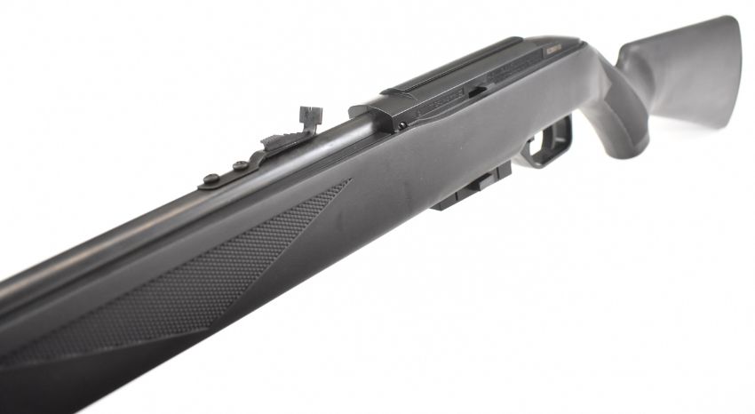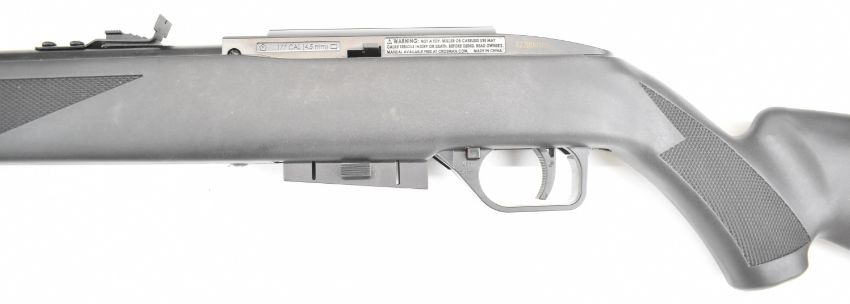 Crosman Repeatair 1077 repeater .177 COair rifle with chequered semi-pistol grip, composite stock, adjustable sights and 12-shot magazine, serial number 822B00105, in original box. PLEASE NOTE: ALL POST - 1939 AIR GUNS CAN ONLY BE SHIPPED TO AN RFD AND NOT TO A HOME ADDRESS.